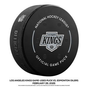 Los Angeles Kings Game-Used Puck vs. Edmonton Oilers on February 26, 2026 - Connor McDavid (EDM) Has Goal & Assist to Reach 100 Points for 9th Time in NHL CareerLos Angeles Kings Game-Used Puck vs. Edmonton Oilers on February 26...
