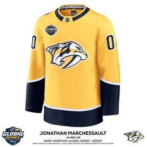 Jonathan Marchessault Nashville Predators #81 2025 NHL Global Series Game-Used Gold Jersey - Worn During the 2nd Period on November 14th, 2025 - Size 54Jonathan Marchessault Nashville Predators #81 2025 NHL Global Serie...