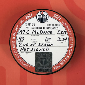Connor McDavid #97 - Edmonton Oilers Goal Puck From Oct 22, 2024 Vs Carolina Hurricanes (2nd Goal Of 2024-25 Season)Connor McDavid #97 - Edmonton Oilers Goal Puck From Oct 22, 2024 V...
