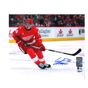 Lucas Raymond Detroit Red Wings Autographed 11" x 14" Red Jersey Tossing Stick Photograph with "Lets Go Wings" Inscription - Limited Edition of 5 Lucas Raymond Detroit Red Wings Autographed 11" x 14" Red...