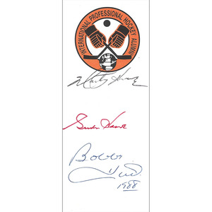 Gordie Howe, Marty Howe & Bobby Hull Autographed International Professional Hockey Alumni PlacardGordie Howe, Marty Howe & Bobby Hull Autographed International Prof...