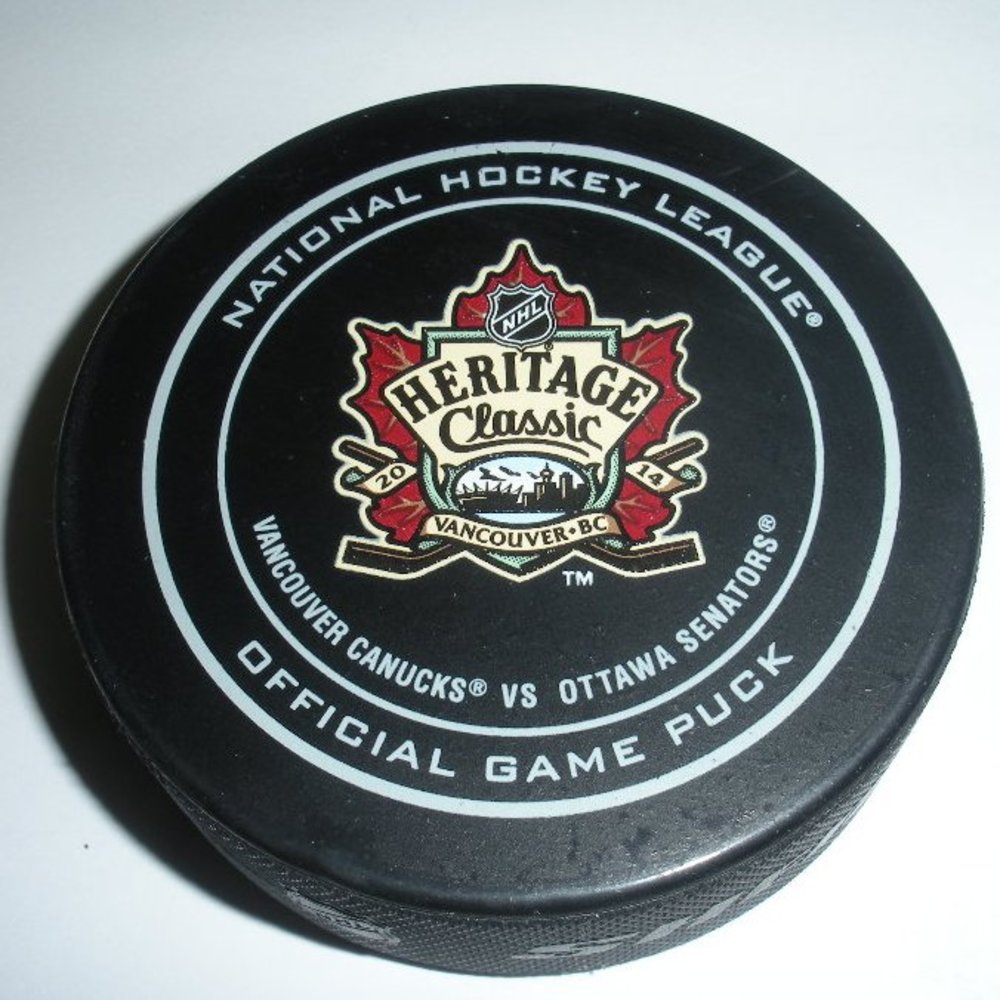 This is the actual puck Vancouver right wing Zack Kassian put past Ottawa goalie Craig Anderson at 11:27 of the first period during the 2014 Tim Hortons NHL Heritage Classic. Kassian's goal, his 11th of the season, was unassisted and gave Vancouver a 2-0 lead.