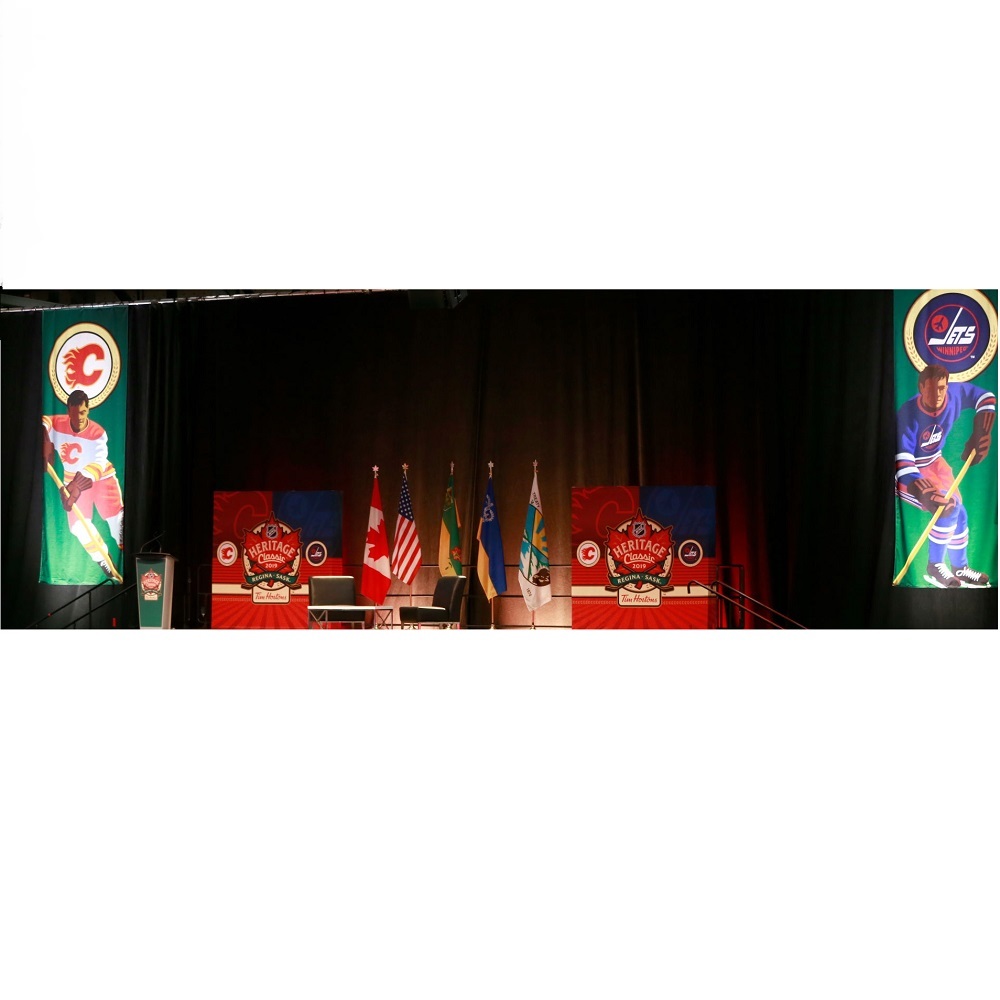 You are bidding on a banner that was created and used around the 2019 NHL Heritage Classic. This banner was hung onstage at the Legacy Luncheon as part of the 2019 Tim Hortons NHL Heritage Classic at the International Trade Centre on October 25, 2019 in Regina, Canada.