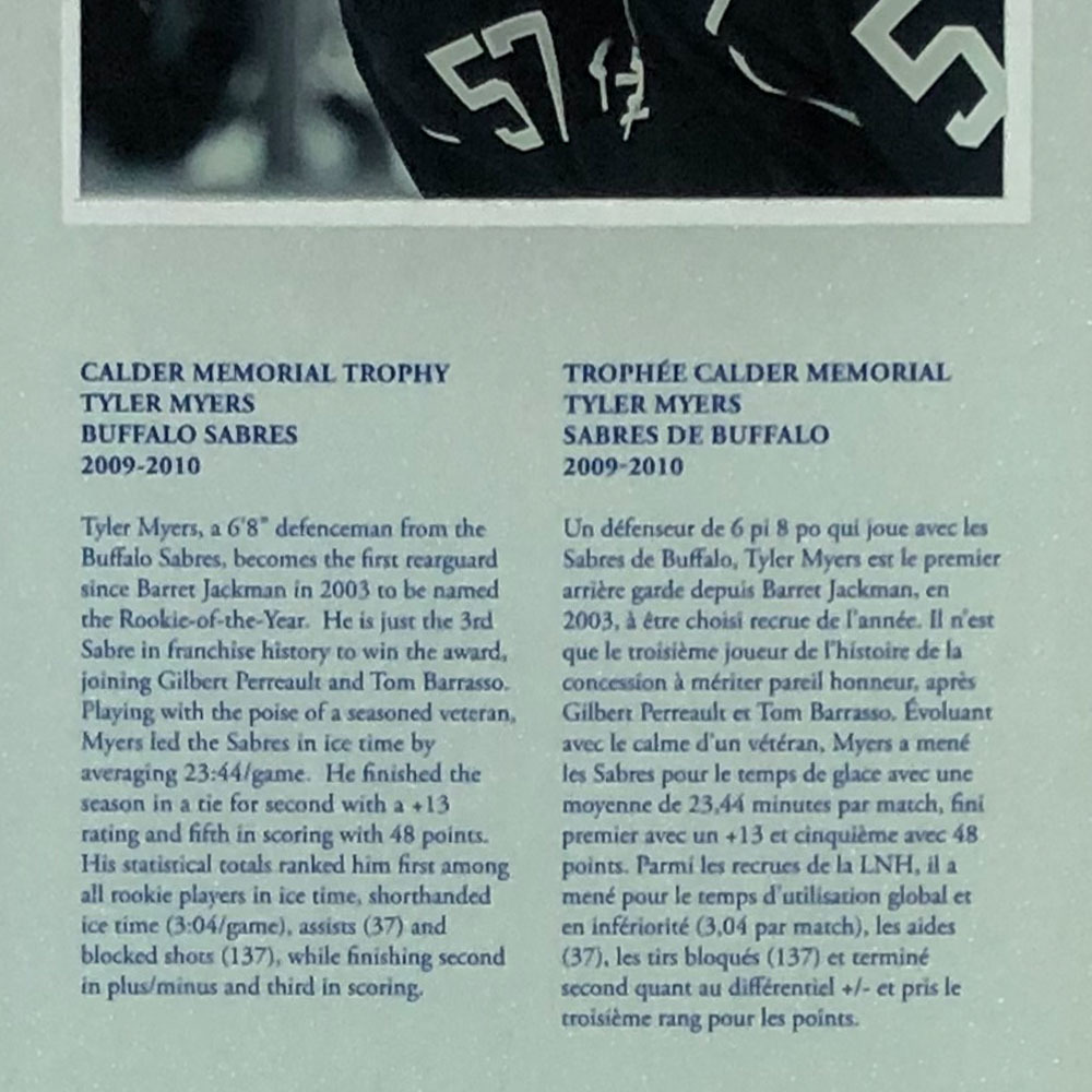 This amazing 13.5X42" (0.5" thick) plexiglass plaque was once proudly on display in the Great Hall of the Hockey Hall of Fame from 2010-11. It was found beside the Calder Memorial Trophy which is awarded annually to the top rookie in the NHL. It acknowledges Tyler Myers as the 2009-10 recipient and includes his photo as well as a short blurb about his award winning season. Very rarely are keepsakes such as this made available for public sale, do not miss your chance.