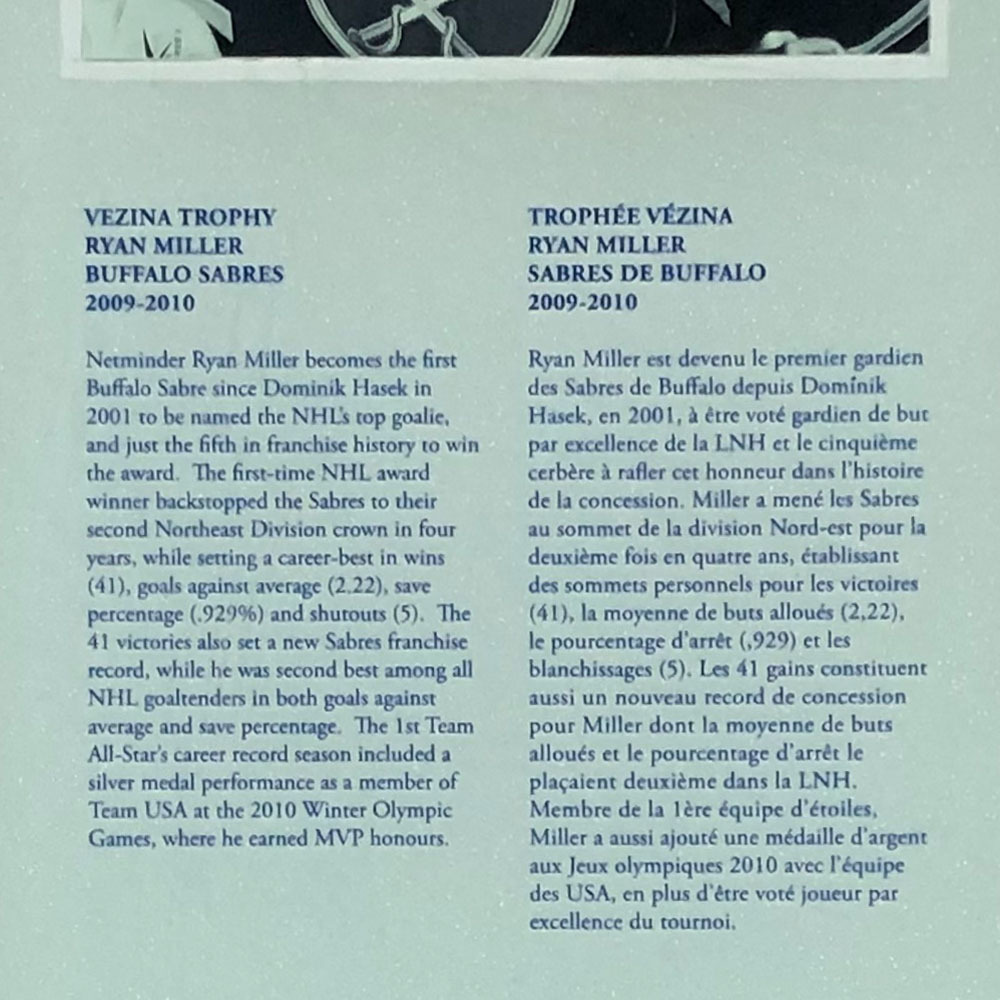 Ryan Miller 2009-10 Vezina Trophy Plexiglass Plaque - Once on Display in the HOF's Great Hall