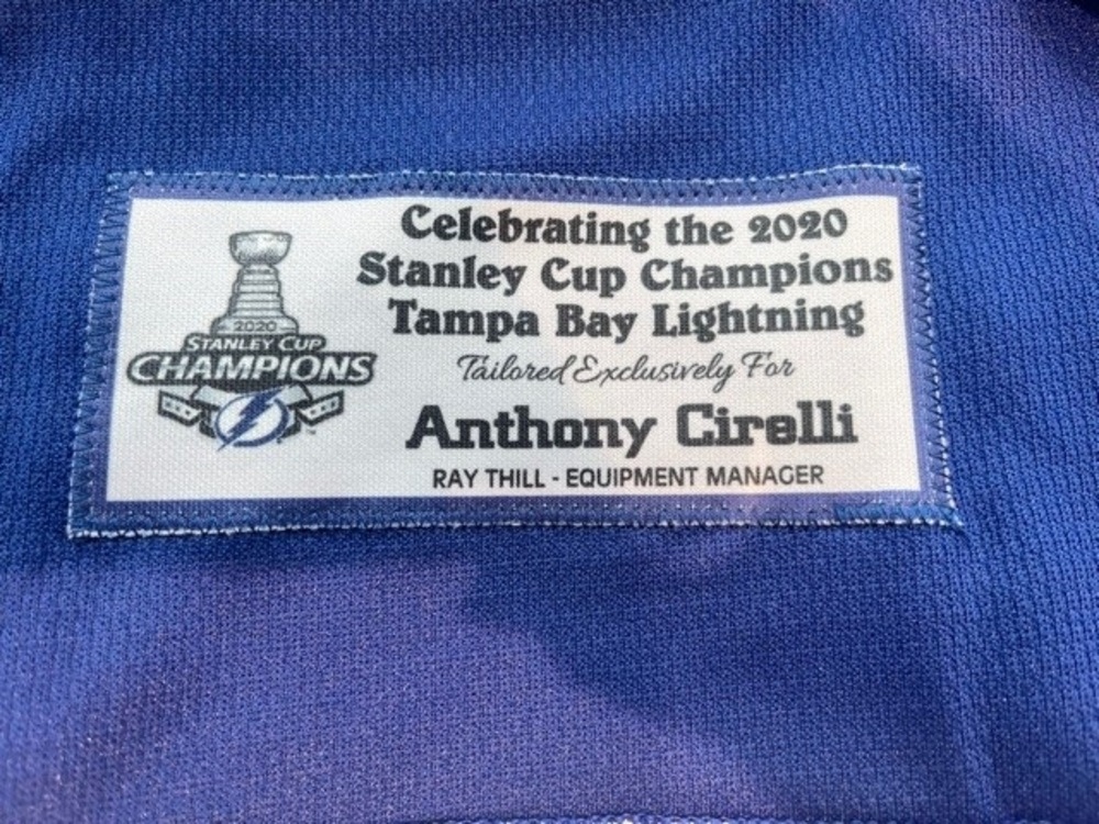 #71 Anthony Cirelli authentic, game-worn Home Blue 2021 Stanley Cup Champion Banner unveiling jersey. Jersey was worn during the game between the Tampa Bay Lightning and the Chicago Blackhawks on January 13, 2021. Proceeds from the jersey auction will benefit Tampa-area charities through the Lightning Foundation. Size 56. For customer service inquiries, please contact Sarah Costello at email address: SCostello@viniksportsgroup.com.