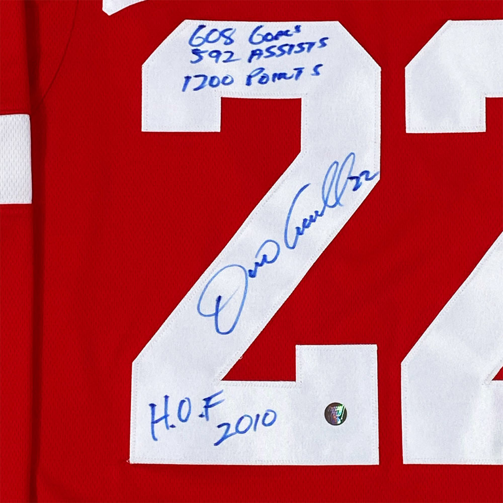 Bid on this outstanding Red Wings adidas pro jersey that has been autographed by HOF'er - Dino Cicceralli. Ciccarelli has inscribed this jersey with his HOF year as well as his impressive career stat line. A must-have for your collection.