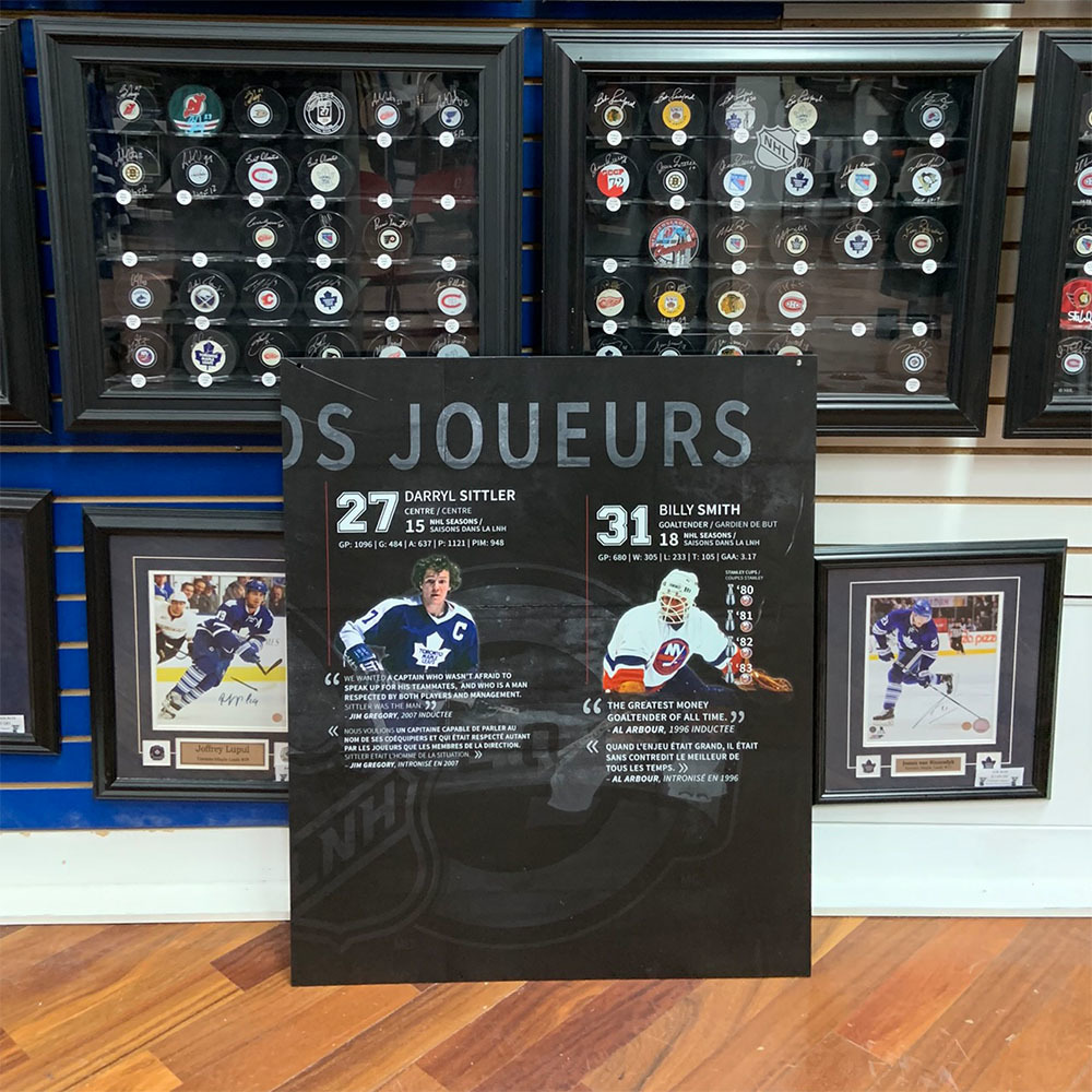 This large 29X35" display has been viewed by thousands of people who visited the Hockey Hall of Fame in Toronto. It was once showcased in an exhibit celebrating the top 100 players of all-time. To commemorate the NHL's centennial in 2017, a list of the top 100 players was agreed upon by an elite hockey panel and announced throughout that year. This backboard featuring DARRYL SITTLER and BILLY SMITH would have been on display during that timeframe. It has been mounted on foam core as well as a hard backing and may still contain velcro strips for hanging purposes. Very rarely are keepsakes such as this made available for public sale, do not miss your chance.Comes complete with a COA from HOF curator and Keeper of the Cup himself - Phil Pritchard.