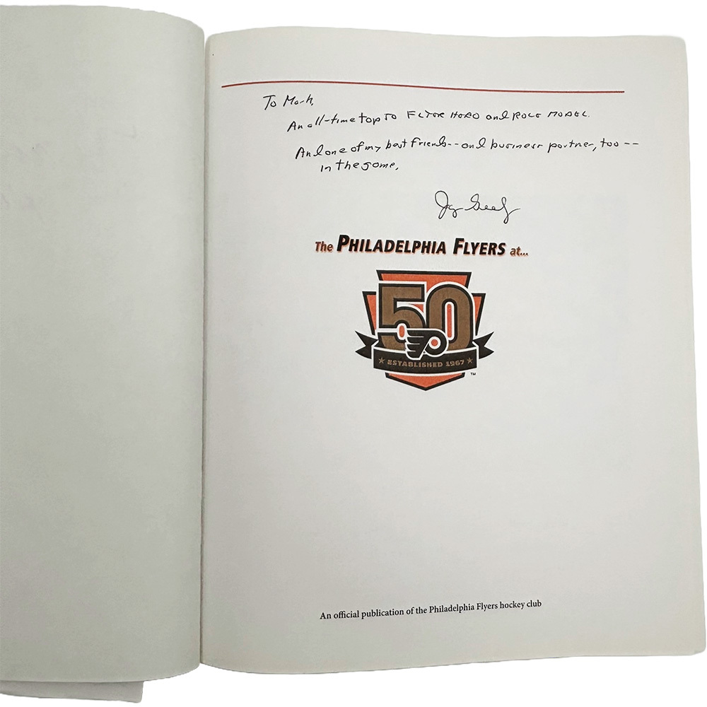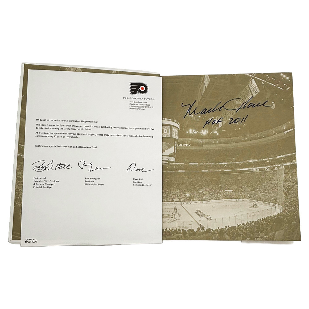 This fantastic hardcover book entitled "The Philadelphia Flyers at 50" comes from the personal collection of Hall of Famer - Mark Howe. Howe is featured in a write-up within and he has signed it once on the cover and then again on the inside. It also includes a personal note from the Flyers organization as well as the author. Unique collectible.