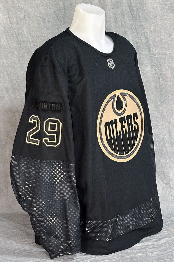 Welcome to the Edmonton Oilers Community Foundation 2025 Online Charity Auction! Show your support for the Foundation and the great charitable initiatives they undertake in Oil Country by bidding on this Leon Draisaitl #29 - Autographed 2025-26 Edmonton Oilers Canadian Armed Forces Appreciation Night Ltd Edition Jersey (Locker Room Walk In Worn Only). The Edmonton Oilers held their annual Canadian Armed Forces Appreciation Night on Tuesday October 28th, 2025 when the club hosted the Utah Mammoth at Rogers Place. During this game the team honored Canadian military members, veterans and their families. Although NHL teams are no longer permitted to wear cause or celebration based jerseys during the pre-game warm up a complete set of these special jerseys were made to commemorate the occasion. They were then autographed by the players with the purposes of auctioning off all in support of charity! Select players (not all) also wore their respective jersey for a very brief time from the parkade into the Oilers locker room when they arrived for the game including Leon Draisaitl. This Fanatics made pro quality camouflage jersey with fight strap features a fully sewn tackle twill Oilers logo on the front. On the back of the jersey the respective player's surname is displayed in black letters with gold outline on a matching black name bar and their jersey number in a two color sewn black with gold outline twill. Inside the collar the jersey has a Fanatics Authentic Pro tag marked Made in Canada and is a size 58 jersey. Last but not least the jersey has been nicely autographed in silver paint marker on the back number by Leon Draisaitl! Please note this is an actual NHL pro-weight on-ice authentic practice jersey with all lettering, numbering and crests professionally stitched onto the jersey. The jersey will come complete with a Letter of Authenticity from the Edmonton Oilers Hockey Club and official Edmonton Oilers 2025-2026 Season "Canadian Armed Forces Appreciation Night, Autographed Jersey Set, (Team Issue Only / Not Worn On Ice)" Tag including their # and surname sewn into the inside bottom hem of the jersey. PLEASE NOTE THE JERSEY WAS ONLY WORN BRIEFLY BY THE PLAYER NOTED IN THIS AUCTION DESCRIPTION FOR A BRIEF TIME AS THEY WALKED FROM THE PARKADE AND INTO THE OILERS LOCKER ROOM. IT WAS NOT WORN ON THE ICE FOR THE PRE-GAME WARM-UP OR AT ANY OTHER TIME THAN MENTIONED ABOVE.