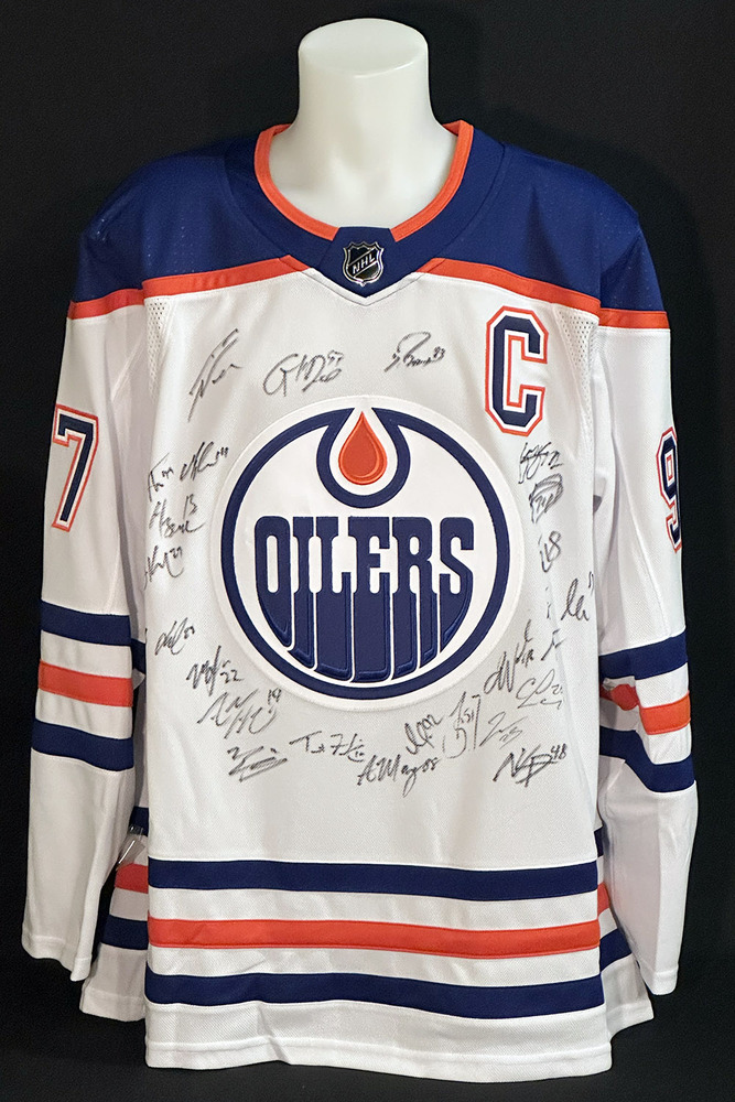 Welcome to the Edmonton Oilers Community Foundation 2025 Online Charity Auction! Show your support for the Foundation and the great charitable initiatives they undertake in Oil Country by bidding on this 2025-26 Edmonton Oilers Team-Signed White Oilers Fanatics Premium Replica Jersey Crested To #97 Connor McDavid. This brand new, never worn, with retail tags removed, fully-crested white Oilers Fanatics Premium level replica jersey (WITH FIGHT STRAP BUT NOT ON ICE AUTHENTIC) (size 54) was recently signed in black marker by 26 members of the Edmonton Oilers 2025-26 season early-October roster. The signatures are of good quality and include Connor McDavid, Leon Draisaitl, Ryan Nugent-Hopkins, Zach Hyman and Stuart Skinner, as well as other big names such as Mattias Ekholm, Darnell Nurse, Andrew Mangiapane and Jake Walman! Simply the perfect gift for the Oilers autograph hound in the family! The jersey will come complete with a Letter of Authenticity from the Edmonton Oilers Hockey Club and Oilers Authentic Tamper Proof Hologram.