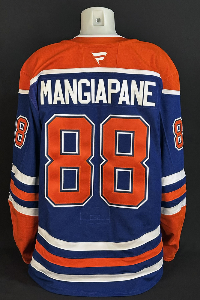 Welcome to the Edmonton Oilers Community Foundation 2025 Online Charity Auction! Show your support for the Foundation and the great charitable initiatives they undertake in Oil Country by bidding on this Andrew Mangiapane game-worn jersey from the Edmonton Oilers game vs the Montreal Canadiens, held on October 23rd, 2025 a 6-5 win in Edmonton. On this night the team wore a brand new set of Oilers royal blue jerseys made by Fanatics for this one game only and for the purposes of auctioning off with proceeds in support of charity! The jersey features a special uniform set tag with unique serial # sewn into the inside bottom hem. The tag reads "Edmonton Oilers, 2025/2026 Season Game-Worn Jersey, Oct 23, 2025 vs Montreal Canadiens" along with the player's jersey # and surname. In addition, an Edmonton Oilers Game-Worn Jersey Inventory serial D00292 unique to this jersey only is imprinted on the edge of the set tag. This particular jersey is a size 56 and was worn by Oilers forward Andrew Mangiapane and is crested with his #88 and surname on the back. As is to be expected the game wear is very light considering the jersey was worn for only the one game and was also washed following the game. It will come exactly as worn and is not autographed. In addition to the set tag certification mentioned above the jersey comes complete with a Letter of Authenticity from the Edmonton Oilers Hockey Club.