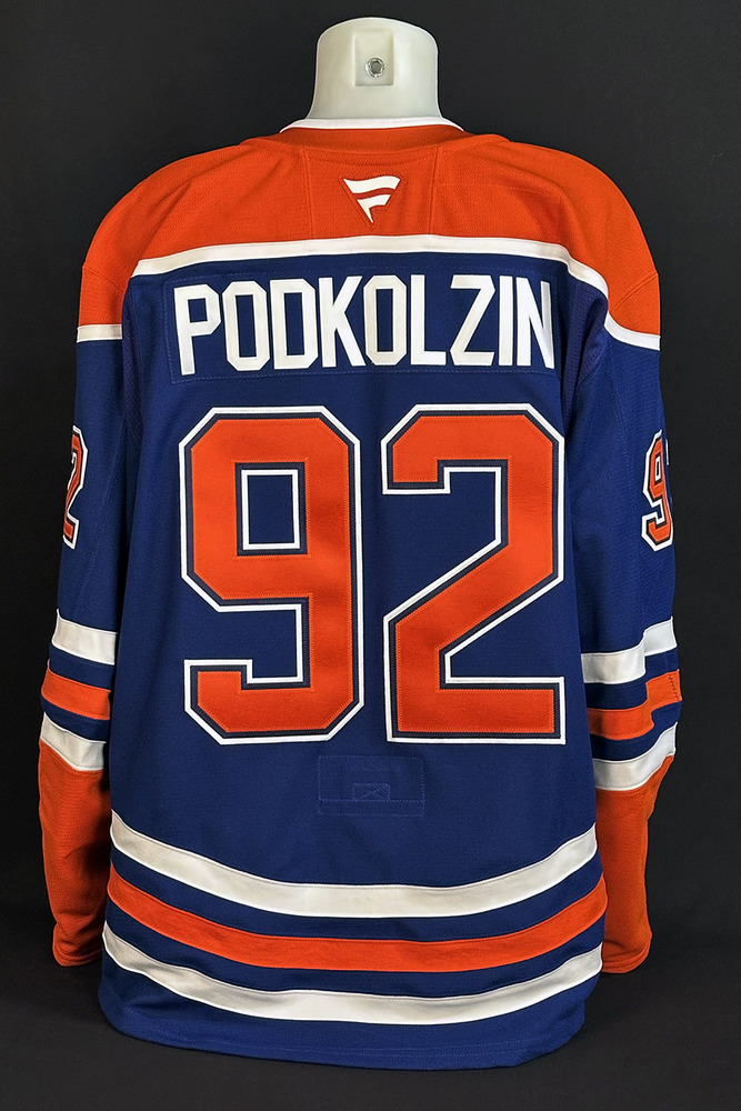 Welcome to the Edmonton Oilers Community Foundation 2025 Online Charity Auction! Show your support for the Foundation and the great charitable initiatives they undertake in Oil Country by bidding on this Vasily Podkolzin game-worn jersey from the Edmonton Oilers game vs the Montreal Canadiens, held on October 23rd, 2025 a 6-5 win in Edmonton. On this night the team wore a brand new set of Oilers royal blue jerseys made by Fanatics for this one game only and for the purposes of auctioning off with proceeds in support of charity! The jersey features a special uniform set tag with unique serial # sewn into the inside bottom hem. The tag reads "Edmonton Oilers, 2025/2026 Season Game-Worn Jersey, Oct 23, 2025 vs Montreal Canadiens" along with the player's jersey # and surname. In addition, an Edmonton Oilers Game-Worn Jersey Inventory serial D00293 unique to this jersey only is imprinted on the edge of the set tag. This particular jersey is a size 58 and was worn by Oilers forward Vasily Podkolzin and is crested with his #92 and surname on the back. As is to be expected the game wear is very light considering the jersey was worn for only the one game and was also washed following the game. It will come exactly as worn and is not autographed. In addition to the set tag certification mentioned above the jersey comes complete with a Letter of Authenticity from the Edmonton Oilers Hockey Club.