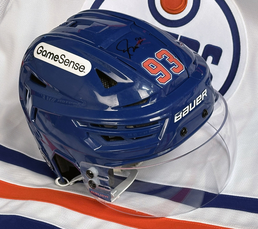 Welcome to the Edmonton Oilers Community Foundation 2025 Online Charity Auction! Show your support for the Foundation and the great charitable initiatives they undertake in Oil Country by bidding on this Ryan Nugent-Hopkins #93 - Autographed 2024-25 Edmonton Oilers Game-Worn Royal Blue Bauer Helmet. This royal blue, Bauer RE-AKT 150 pro model helmet was worn by Nugent-Hopkins during the 2024-25 regular season for home games from the start of the season up to and including the December 16th, 2024 game vs the Florida Panthers. The helmet was then put out of use and a new helmet was given to him to wear. It shows nice game use throughout with minor scuffing on the exterior which is to be expected. It has been decaled with Nugent-Hopkins #93 and the GAME SENSE sponsor logo on both sides of the helmet as well as the NHL Unity & Equality decal on the back right corner and small Oilers logo on the left side. Last but not least it has been autographed by Ryan Nugent-Hopkins in black marker and will come complete with a Letter of Authenticity from the Edmonton Oilers Hockey Club, Edmonton Oilers Authentic Inventory Hologram and Official Locker Room Equipment Program tag. This great game-worn collectible from the Oilers star forward will look fantastic in any Oilers memorabilia collection! Please note that this helmet is sold for collectible and display purposes only and is not intended to be used as protective head gear.