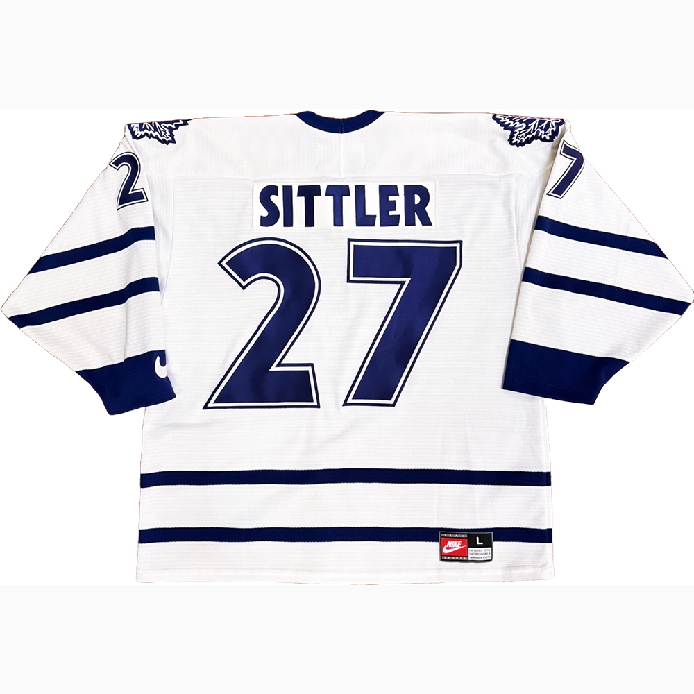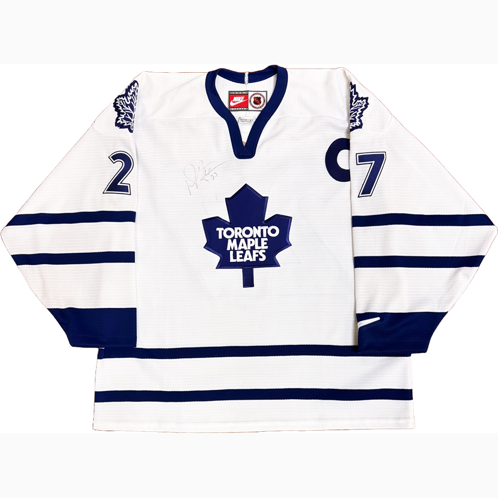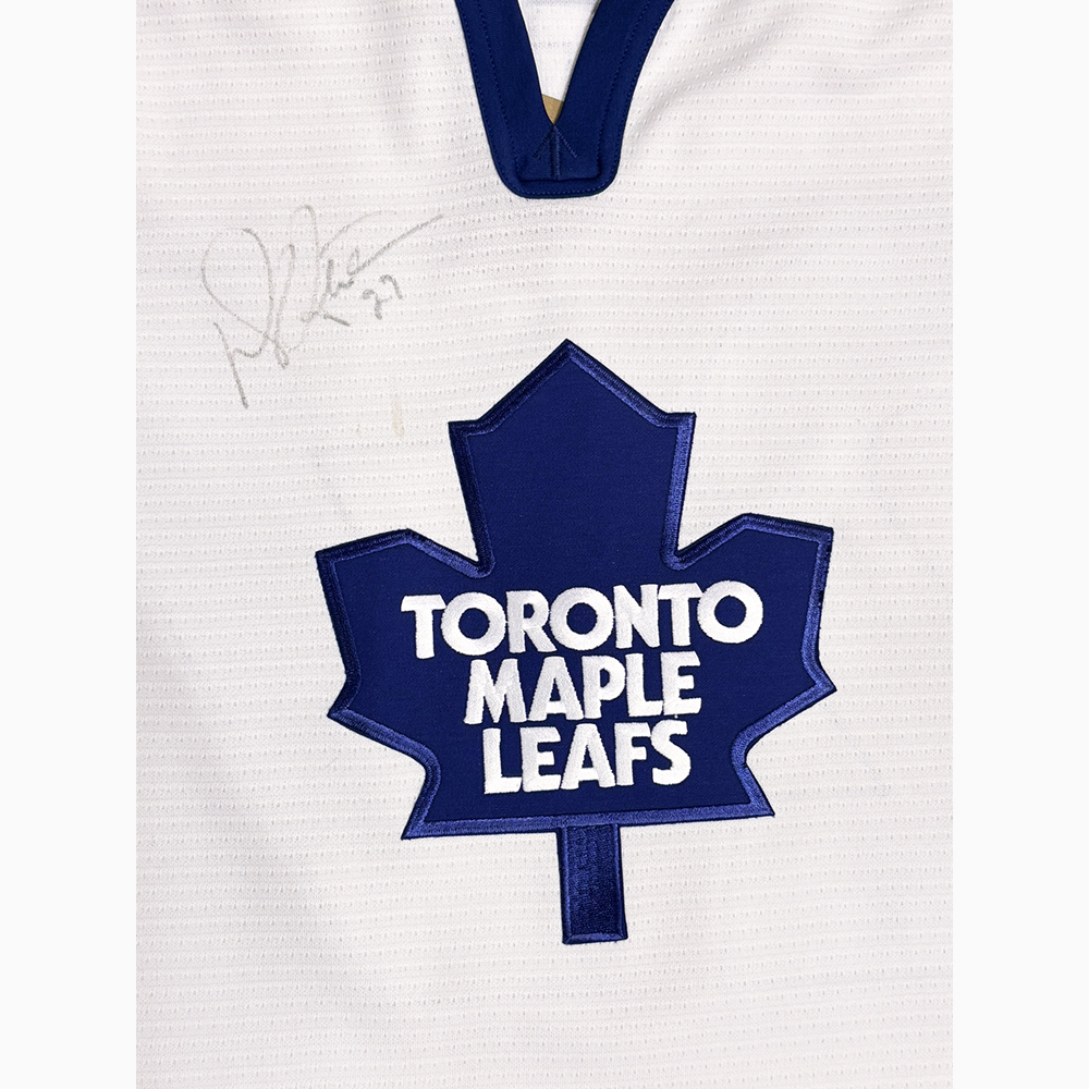 Bid on this Toronto Maple Leafs Nike jersey signed by franchise legend - Darryl Sittler. The size large jersey features the classic Maple Leafs crest on the front and Sittler's iconic number 27 on the back and sleeves. Sittler has signed the front of the jersey above the crest. PLEASE NOTE - there are a few minor stains on the jersey, see images.