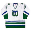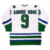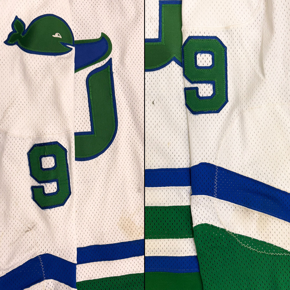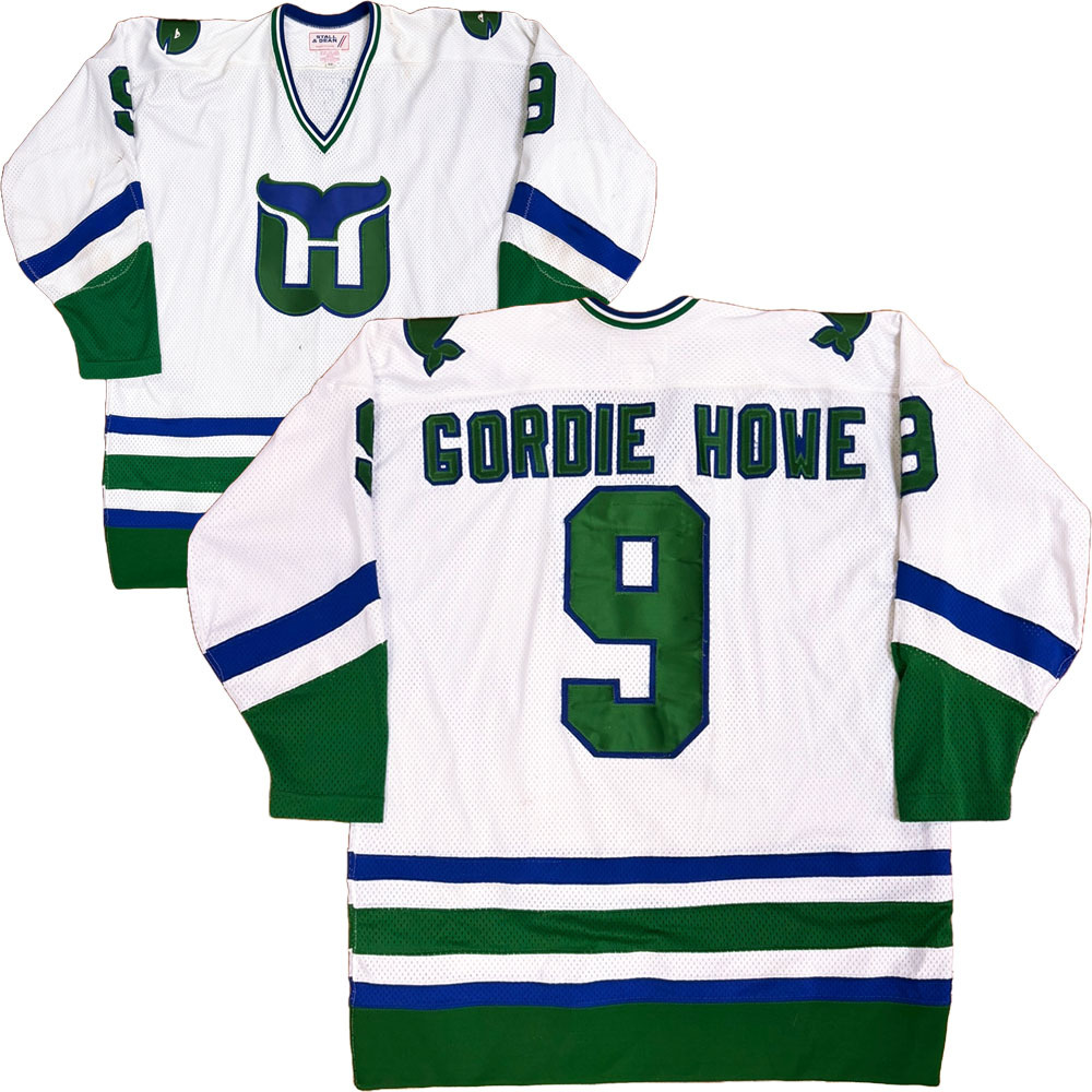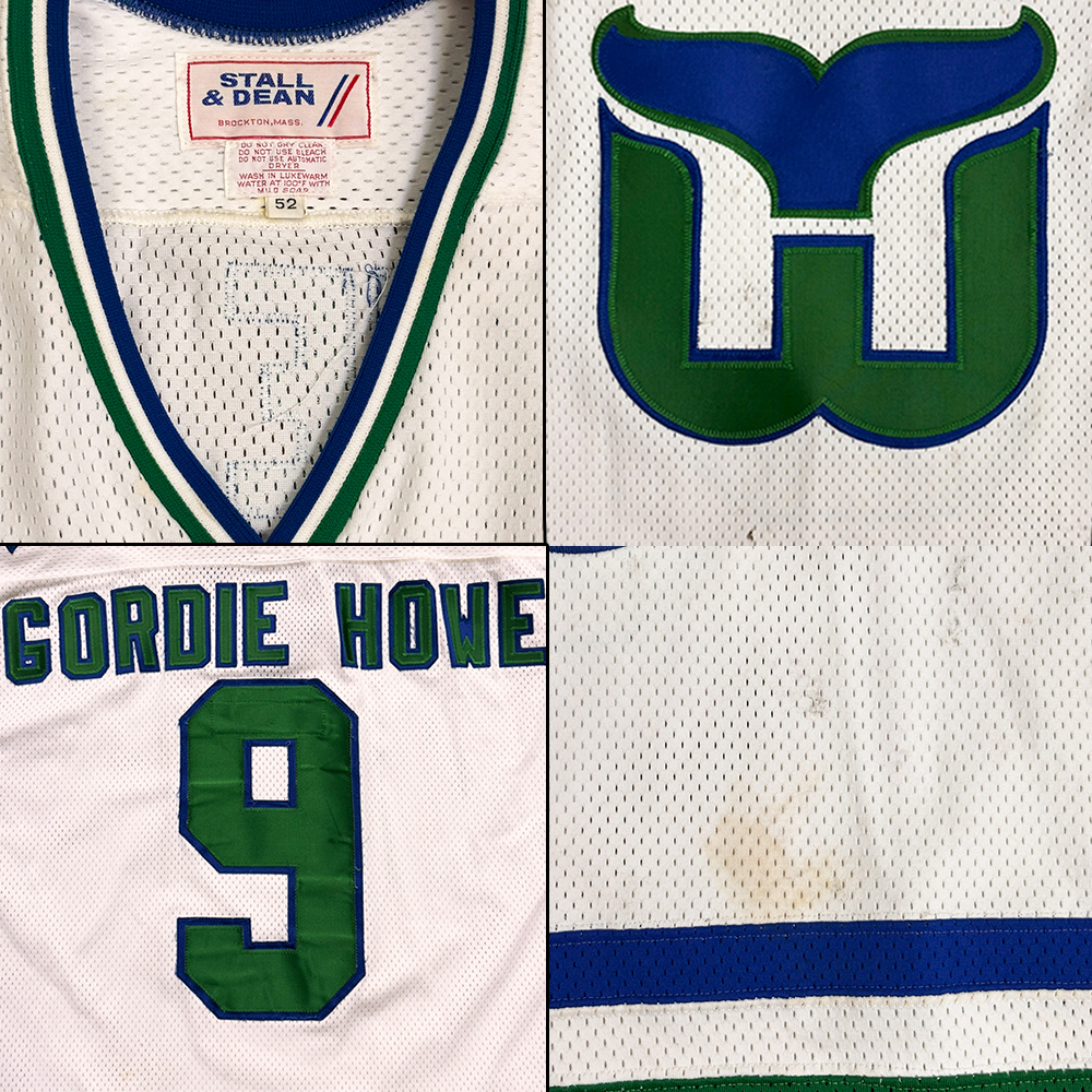 This Stall & Dean size 52 white jersey features the iconic Whalers "W" logo sewn on the chest, green/blue striping on the sleeves and waist, and Howe's #9 and "GORDIE HOWE" stitched on the back. The jersey exhibits good wear including stick/board marks and scuffs mainly visible on the lower front and sleeves. It has been professionally photomatched and comes with Letter of Authenticity from Mark and Marty Howe.