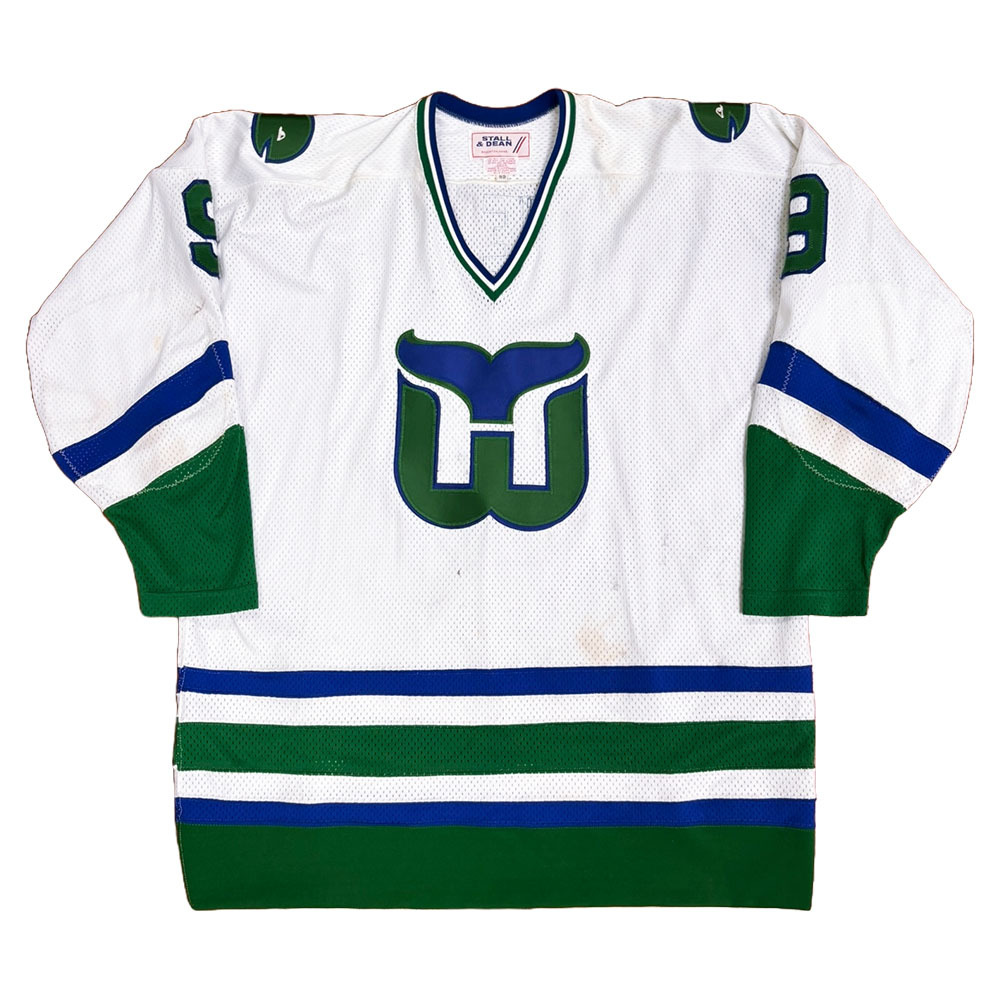 This historic Hartford Whalers jersey was worn by Gordie Howe during his final NHL season in 1979-80. It was donned by Mr. Hockey during home games at the Hartford Civic Center that season, including his very final playoff game on April 11, 1980. He also became the first player in NHL history to score 800 goals while wearing it. This jersey marked the closing chapter of one of the most extraordinary careers in sports history. Until recently, it had called the Hockey Hall of Fame home for many years.
