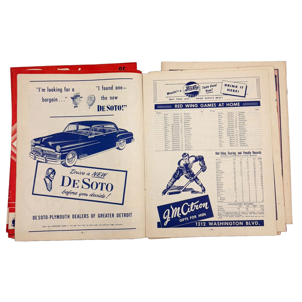 This vintage collection of 1950-51 Detroit Red Wings programs comes from the personal collection of Mr. Hockey - Gordie Howe. The 14 programs capture a defining season in Red Wings history that witnessed Terry Sawchuk's rookie year as well as Gordie's 1st Art Ross Trophy and league goal title. Notable programs include the 1950 NHL All-Star Game (Red Wings vs. NHL All-Stars), Red Wings 1950-51 Home Opener and an Oct. 10th program signed on the cover by Ted Lindsay and Gordie.