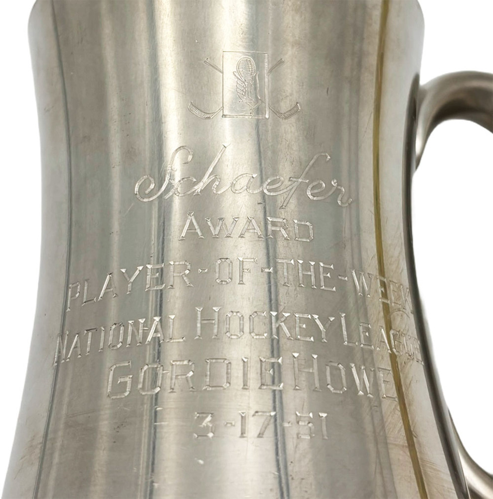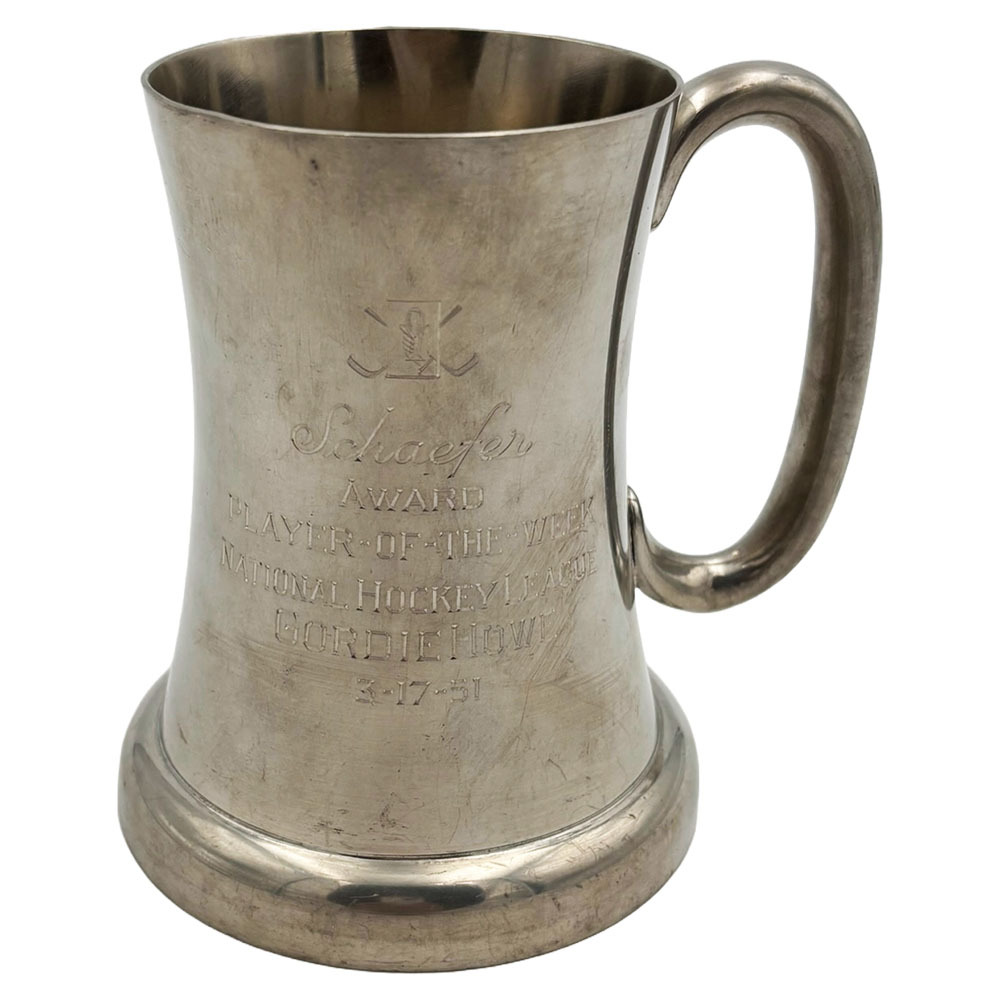This 1951 Schaefer Award comes from the personal collection of Mr. Hockey - Gordie Howe. In the 1950s, the Schaefer Award for Player of the Week was presented to an NHL player chosen by the editors of The Hockey News, with sponsorship from the F. & M. Schaefer Brewing Co. This particular one was awarded to Gordie Howe for his player of the week honors on March 17, 1951. The vintage pewter tankard was crafted by James Dixon & Sons of Sheffield, England and stands just over 5" tall. It has been engraved with the award name, details and Gordie's name.