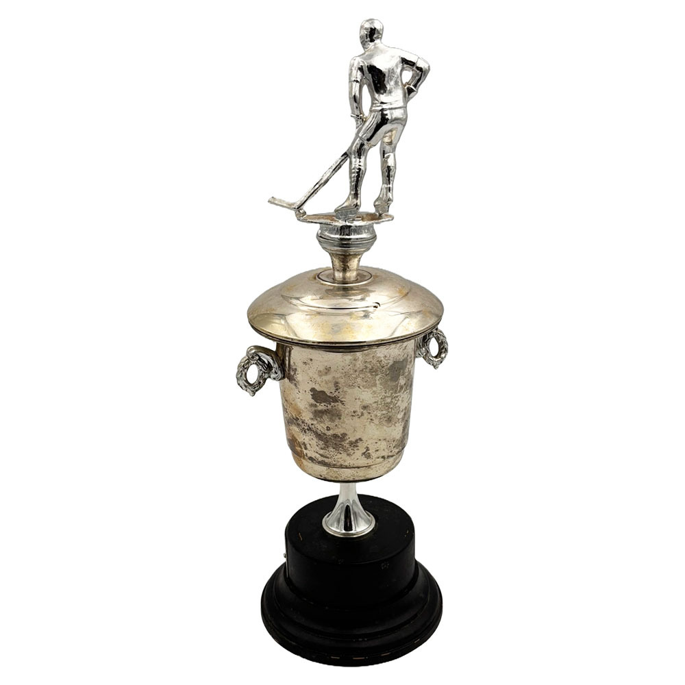 This Sport Magazine "Top Performer in Hockey" trophy was awarded to Mr. Hockey - Gordie Howe in recognition of his dominance over two decades from 1946 to 1966. The silver-toned trophy features a hockey player on top, ornate side handles, and is engraved with "SPORT Magazine - Top Performer in Hockey - 1946-1966". It also proudly displays a curved plate at the base with Gordie's name on it. The trophy measures 5X5" at the base and stands 17" tall.