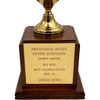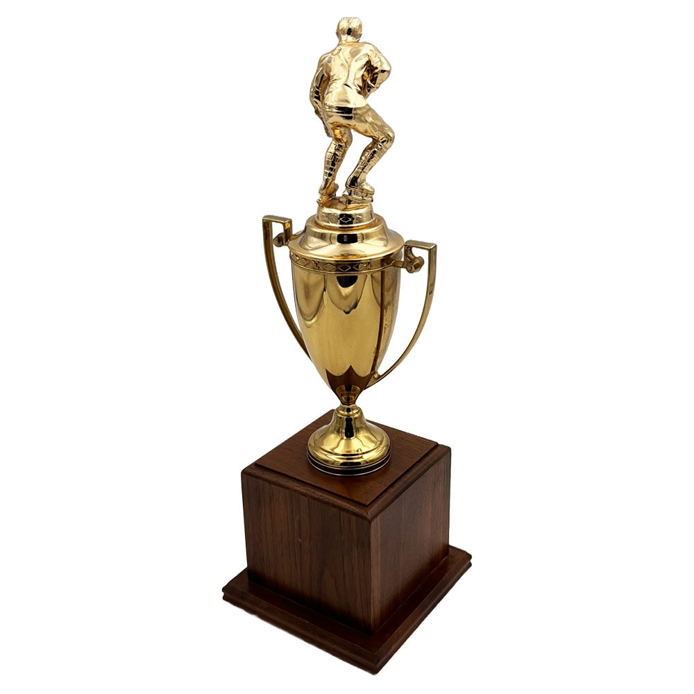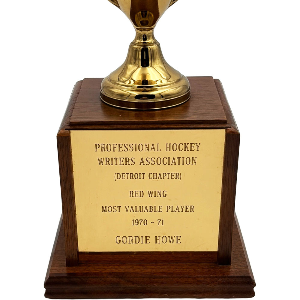 This 1970-71 Professional Hockey Writers Association (Detroit Chapter) Most Valuable Player Trophy was awarded to Mr. Hockey - Gordie Howe after the final season of his illustrious Detroit Red Wings career. Recognized by the very writers who covered the team daily, this MVP honor highlighted Howe's enduring excellence at age 42, when he still finished among the team's scoring leaders. The gold-finished trophy features a classic two-handled cup atop a solid wood base that measures 6X6" and stands 17" tall. A large engraved plaque featured on the base reads ""Professional Hockey Writers Association (Detroit Chapter) - Red Wing Most Valuable Player 1970-71 - Gordie Howe".