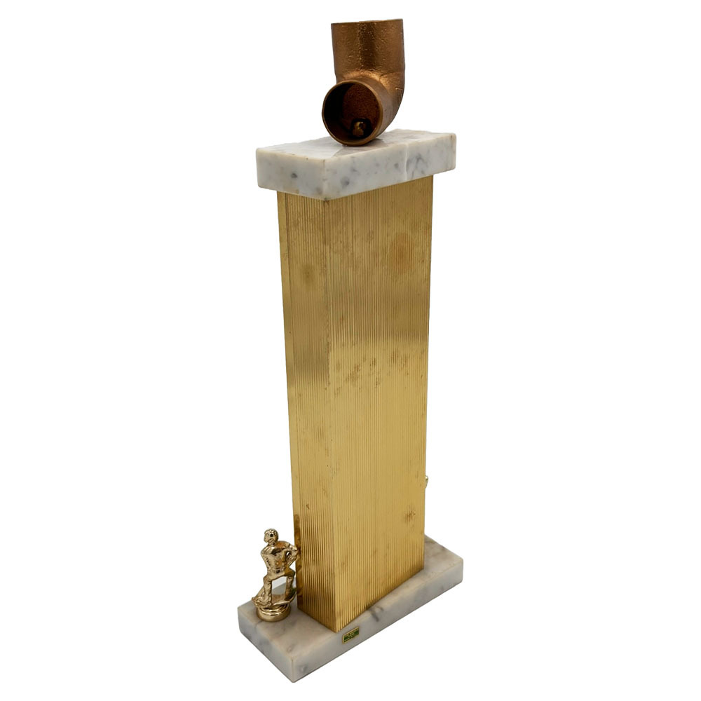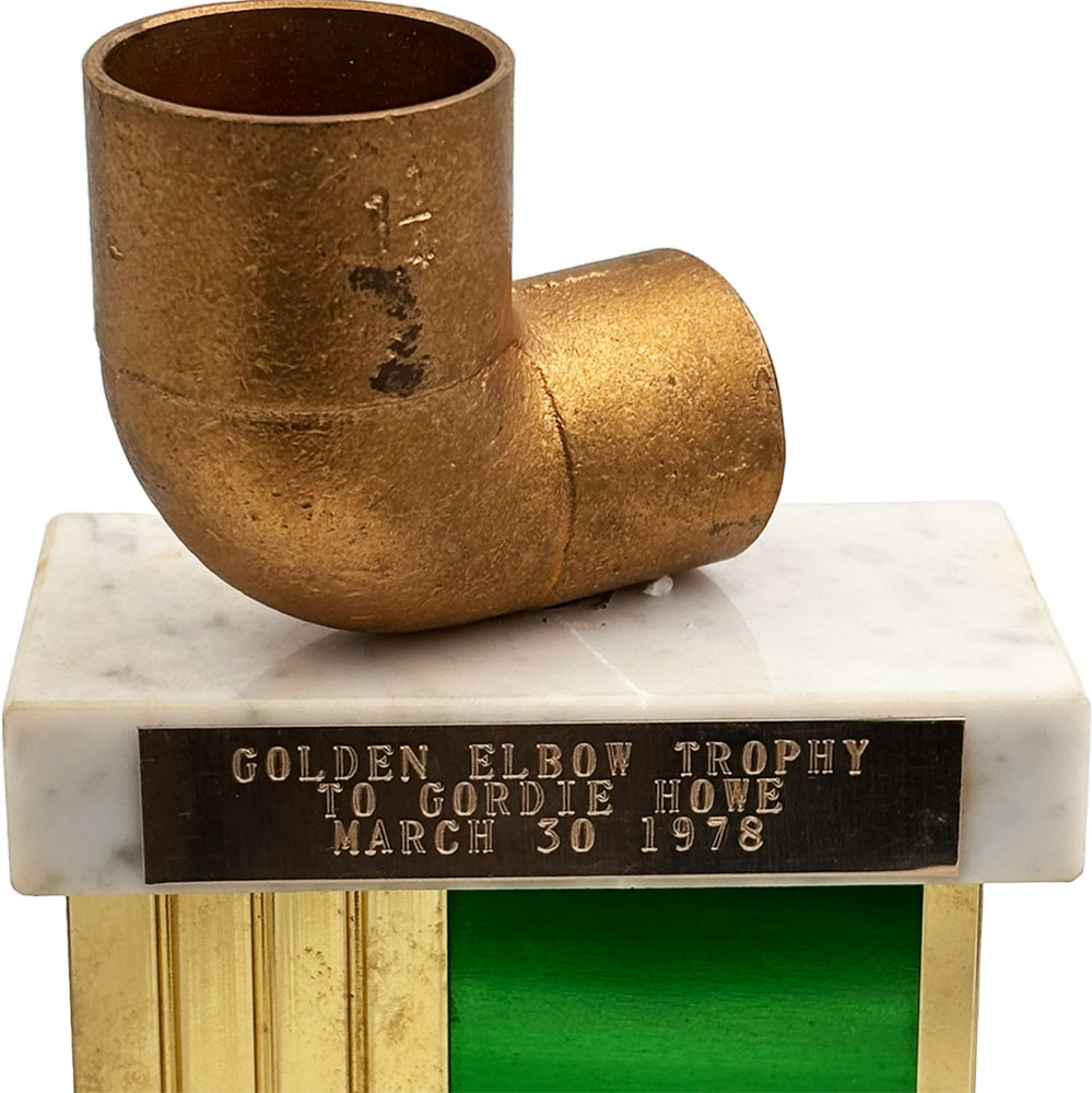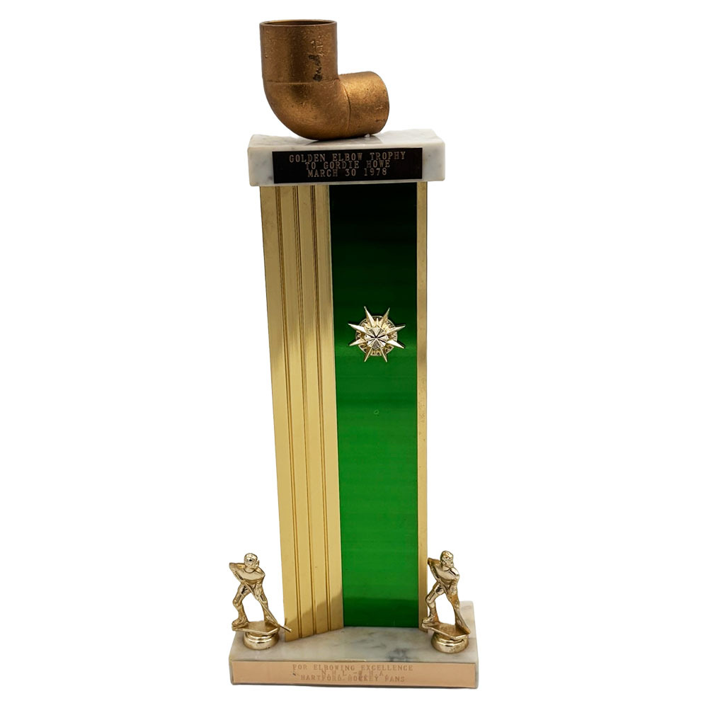 This one-of-a-kind "Golden Elbow Trophy" was humorously presented to Mr. Hockey - Gordie Howe on March 30, 1978. It commemorates his legendary toughness and trademark physical play. The award comes complete with a gold-painted plumbing elbow mounted atop a Whalers green column and includes an engraved nameplate reading "For Elbowing Excellence - NHL & WHA - Hartford Hockey Fans". It measures 2.5X6" at the base and stands 15" tall.