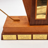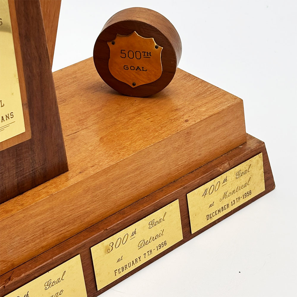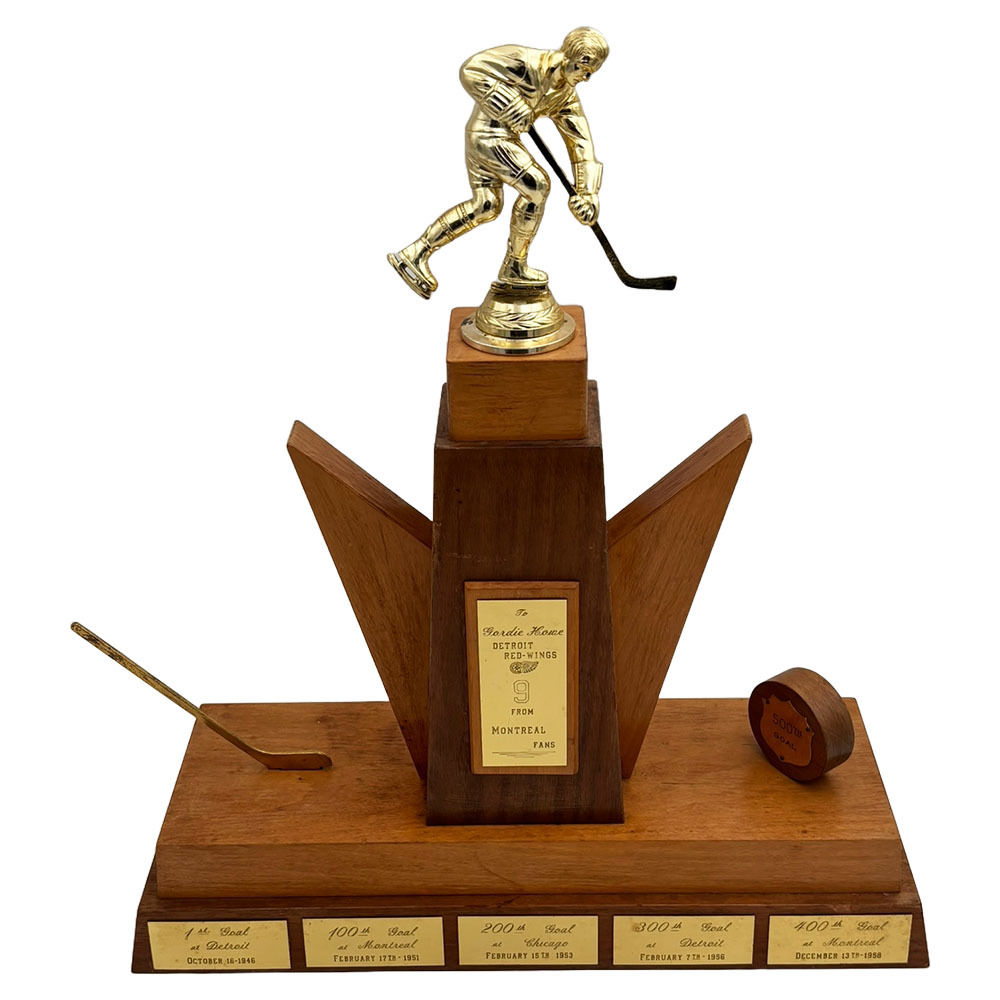 This incredible Gordie Howe milestone trophy was presented to Mr. Hockey by fans in Montreal to commemorate his 500th career goal scored on March 14, 1962. Crafted from rich wood it features multiple plaques highlighting each of Howe's major goal-scoring milestones to that point - his 1st, 100th, 200th, 300th, 400th, and 500th. The central plate reads "To Gordie Howe, Detroit Red Wings #9, From Montreal Fans", while each engraved milestone plate includes the date and city where it occurred. The large trophy measures 6X17" at the base and stands 20" tall.