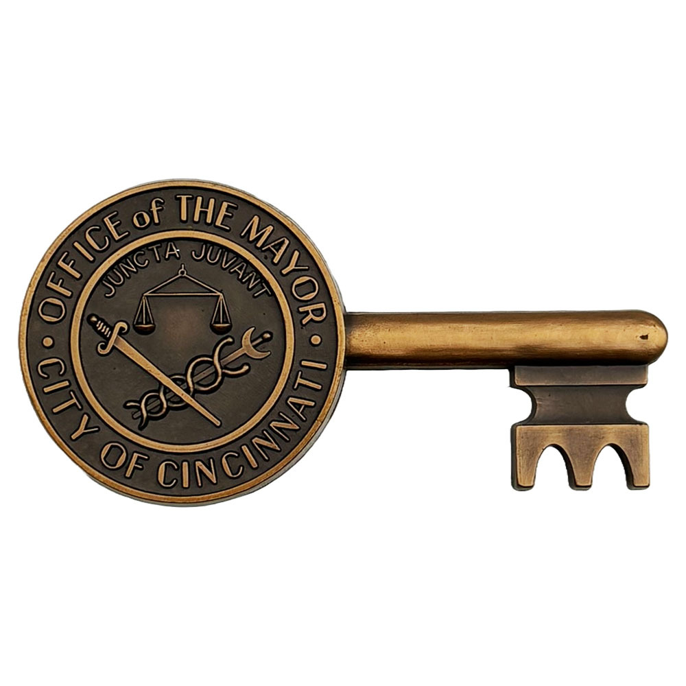 This bronze "Key to the City" was presented to Gordie Howe by the Office of the Mayor of Cincinnati. Measuring approximately 4" in long, it features the city seal and Latin motto Juncta Juvant ("Strength in Unity"). A unique honor from the personal collection of Mr. Hockey.