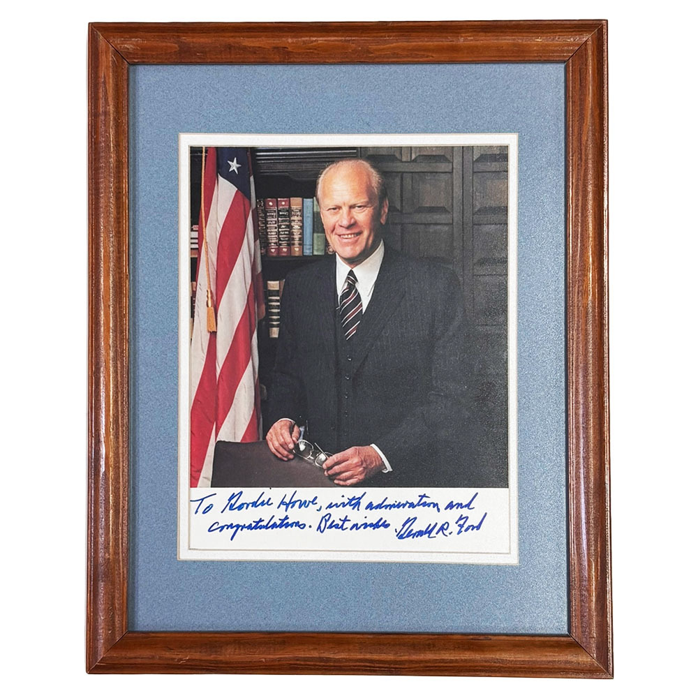 This framed photo comes from the personal collection of Mr. Hockey himself - Gordie Howe. It features an autographed 8X10 photo of former U.S. President Gerald R. Ford (deceased 2006) that is personalized to Gordie. The frame was proudly displayed in the Howe Family home and measures 12X15" in size..