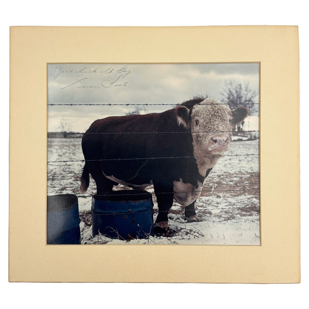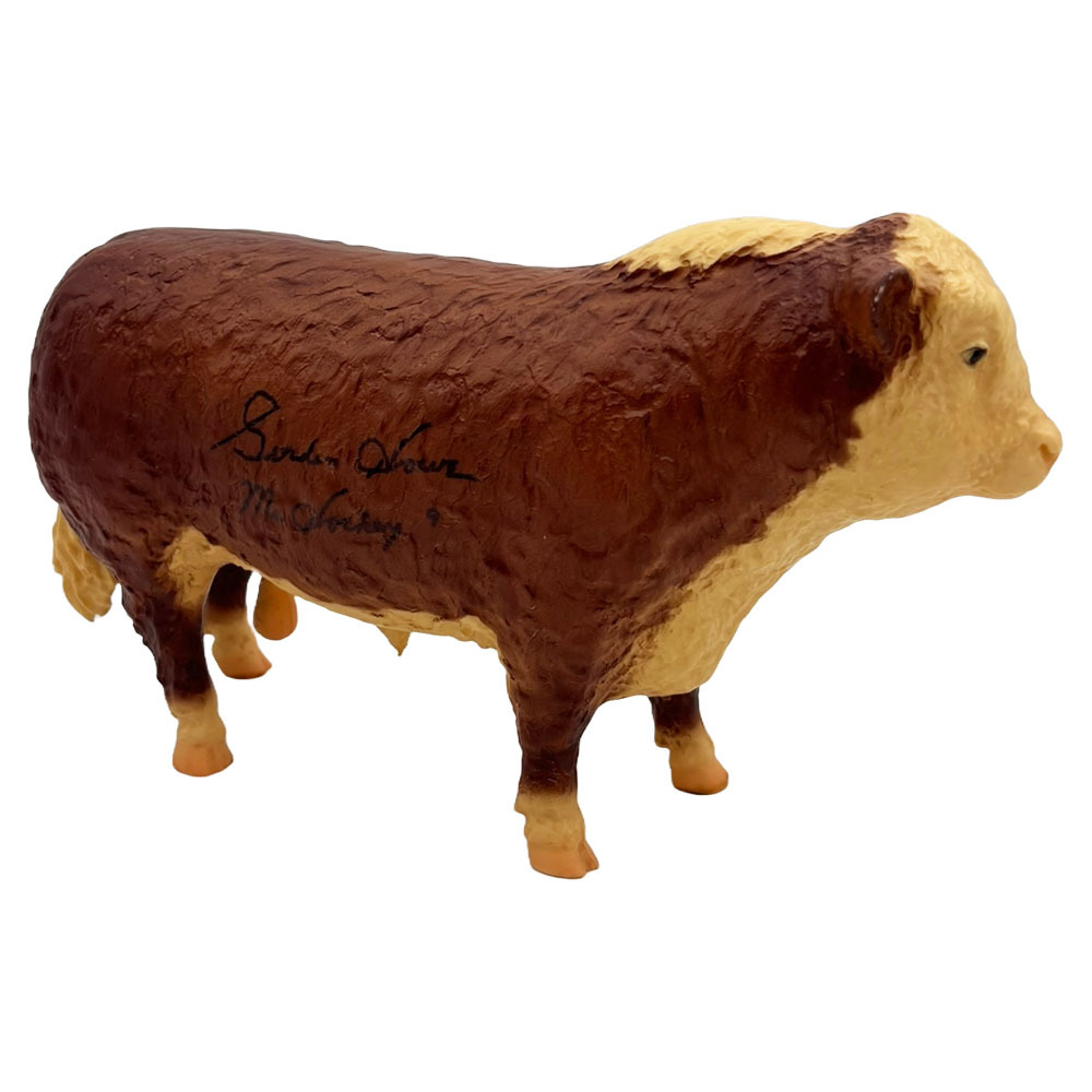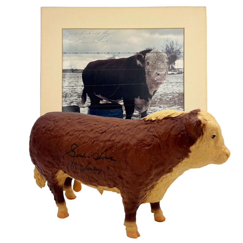 This rare lot comes from the personal collection of Mr. Hockey himself - Gordie Howe. It includes a signed photo of Gordie's award-winning bull from the Michigan State Fair, along with a hand-painted figurine also signed by Howe. The 8X10 photo comes complete with white matting while the figure measures 11X7X4" in size. The signature on the photo has faded over time.