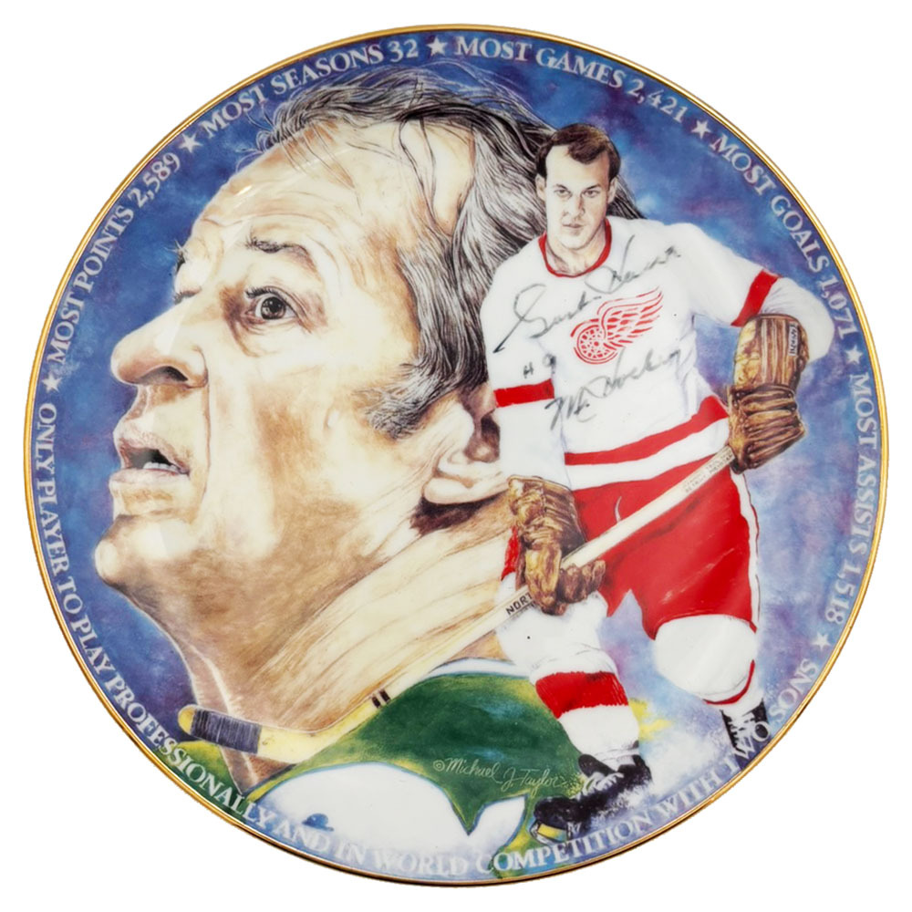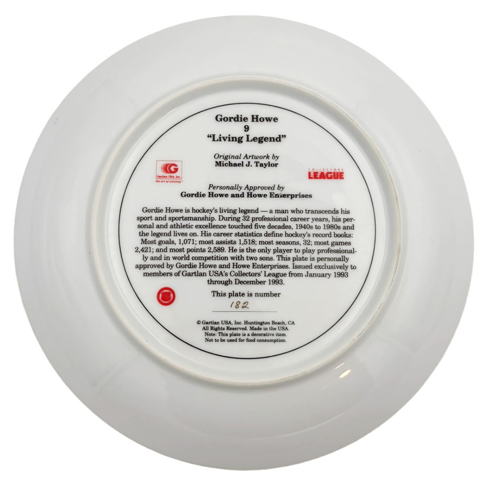 You are bidding a commemorative plate that was part of the late, great Gordie Howe's own personal collection. This limited-edition (#182) gold rimmed plate was manufactured by Gartlan and commemorates Gordie's record setting career. It measures 8.5" wide and displays a slighty faded black Gordie signature.