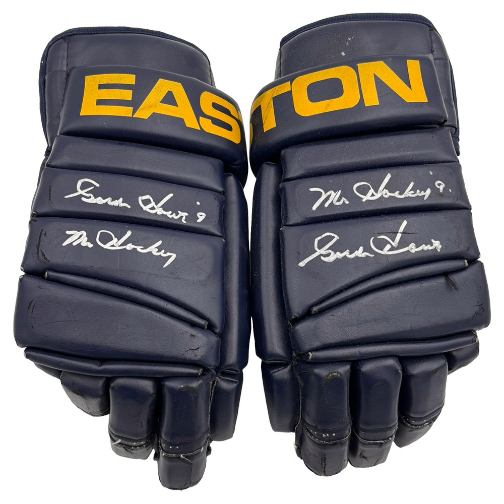 These Easton hockey gloves were worn and come from the collection of former NHL great - Marty Howe. The navy gloves have been autographed by his legendary father Gordie in silver, with his iconic "Mr. Hockey" inscription on each cuff. The number "25" has written in yellow on the top of one of the glove.
