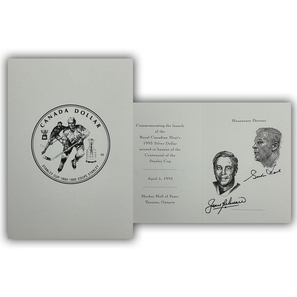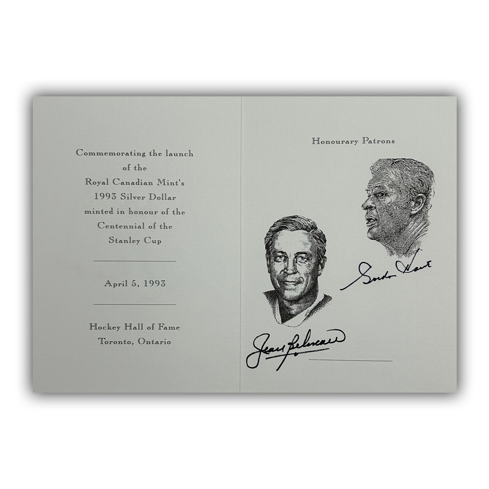 This commemorative card (5X8") comes from the personal collection of Mr. Hockey - Gordie Howe. It is one of only 250 cards gifted by the Royal Canadian Mint to celebrate the 1993 release of the Stanley Cup's 100th Anniversary silver dollar. It has been signed on the inside by the honorary patrons Gordie Howe and Jean Beliveau.