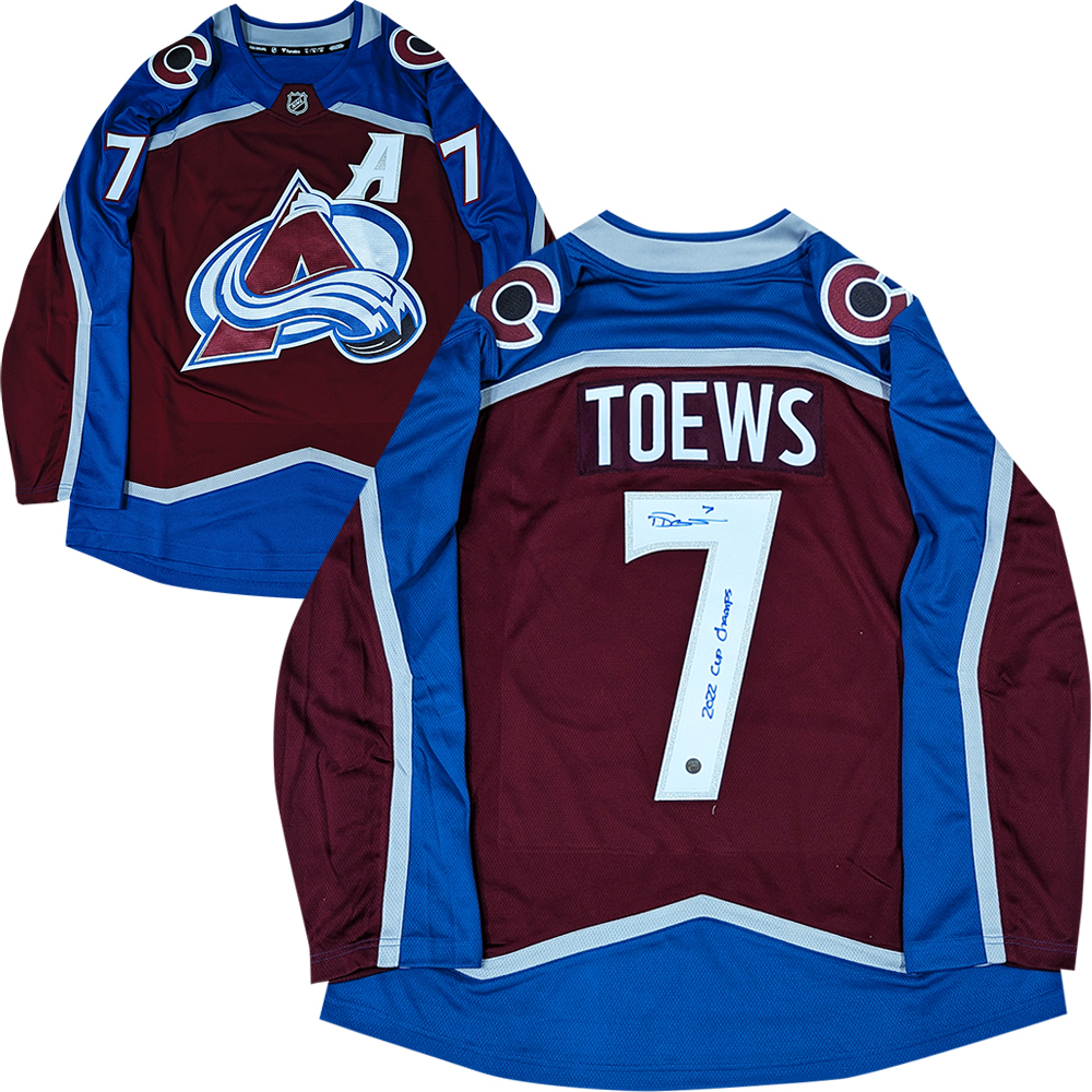 Bid on this outstanding Colorado Avalanche Fanatics Breakaway jersey signed by NHL star - Devon Toews. He has inscribed it with "2022 Cup Champs".