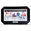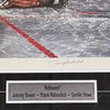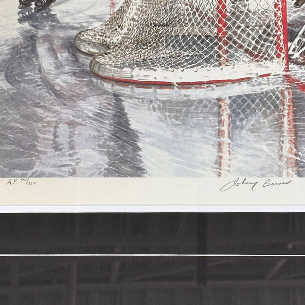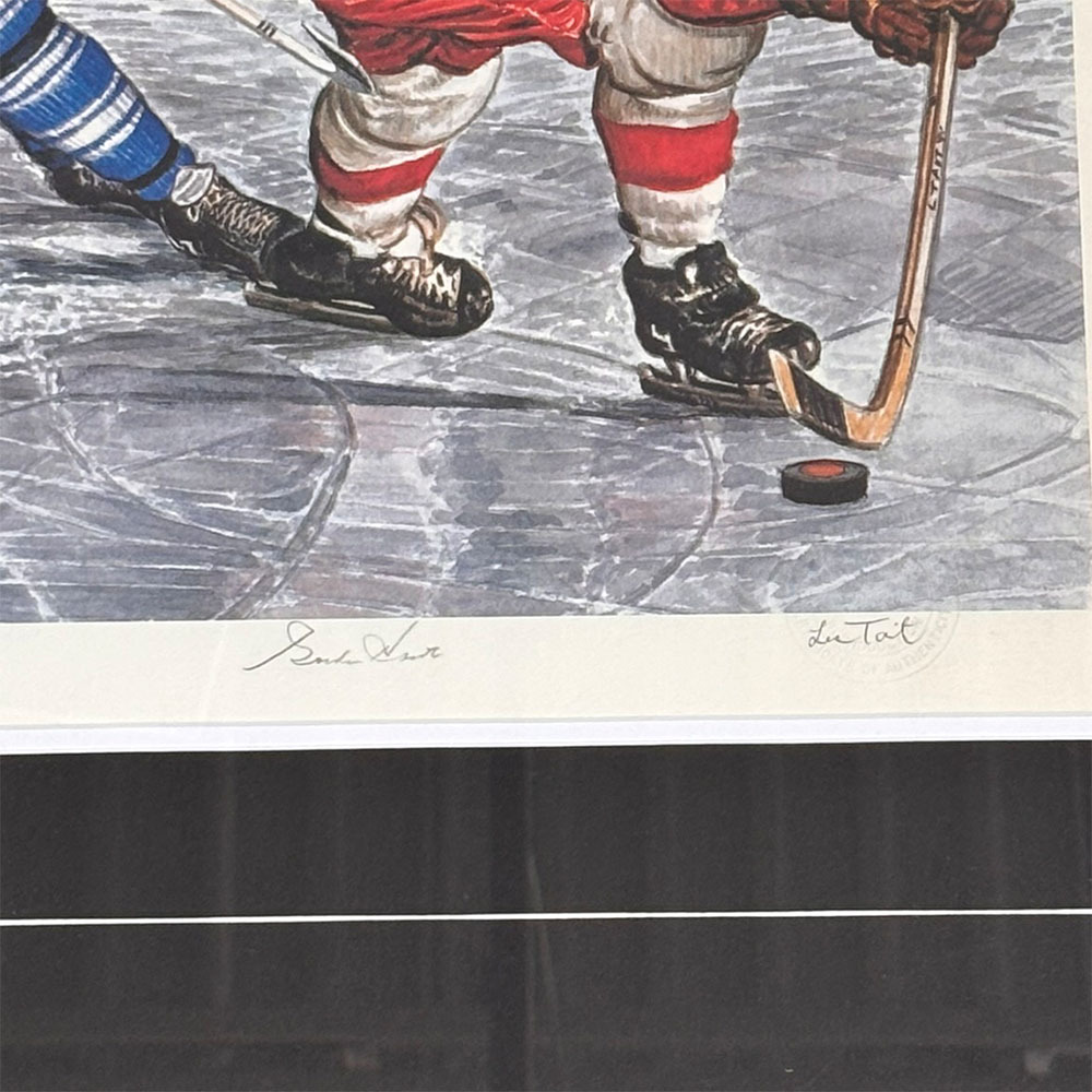 Bid on this large framed lithograph titled "Rebound" that has been autographed by hockey legends Gordie Howe, Johnny Bower, and Frank Mahovlich. The artwork by artist Len Tait captures an intense moment between the Red Wings and Maple Leafs and is a numbered artist proof edition #342/350. It measures 26X41" in size with frame.