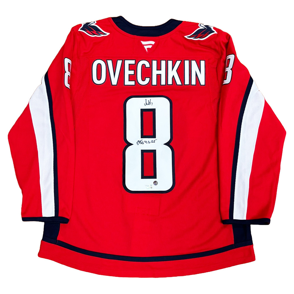 Bid on this Washington Capitals Fanatics Premium jersey that has been signed by one of the greatest in Alex Ovechkin. Ovechkin passed Gretzky has the all-time leader in goals scored with 895 on April 6, 2025. He has added this incredible achievement to the jersey as an inscription. It comes with Fanatics authentication.