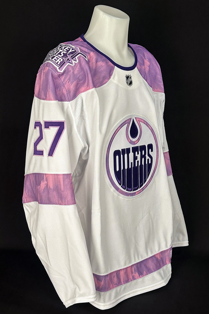 Welcome to the Edmonton Oilers Community Foundation 2025 Online Charity Auction! Show your support for the Foundation and the great charitable initiatives they undertake in Oil Country by bidding on this Brett Kulak #27 - Autographed 2025-26 Edmonton Oilers Hockey Fights Cancer Night Ltd Edition Jersey (Autographed Only / Not Worn On Ice). During the Oilers vs Dallas Stars game on the evening of Tuesday November 25th, 2025 in support of the NHL Hockey Fights Cancer initiative the team hosted their annual Hockey Fights Cancer night. Although NHL teams are no longer permitted to wear cause based jerseys during the pre-game warm up a complete set of these special jerseys were made and autographed by the players with the purposes of auctioning off all in support of charity! This Fanatics made pro quality jersey with fight strap features a lavender color Oilers logo on the front and NHL Hockey Fights Cancer crest on the right shoulder. On the back of the jersey the respective player's surname is displayed in lavender letters on a white name bar and their jersey number in a two tone lavender and purple pro twill. Inside the collar the jersey is marked Made in Canada and a size 56 tag is present. Last but not least the jersey has been nicely autographed in silver paint marker on the back number by Brett Kulak! Please note this is an actual game-weight on-ice authentic jersey (NOT WORN BY PLAYER ON ICE) with all lettering, numbering and crests professionally stitched onto the jersey. The jersey will come complete with a Letter of Authenticity from the Edmonton Oilers Hockey Club and official Edmonton Oilers 2025-26 Season Hockey Fights Cancer Night Autographed Jersey Set, (Team Issue Only / Not Worn On Ice) Tag including their # and surname sewn into the inside bottom hem of the jersey.