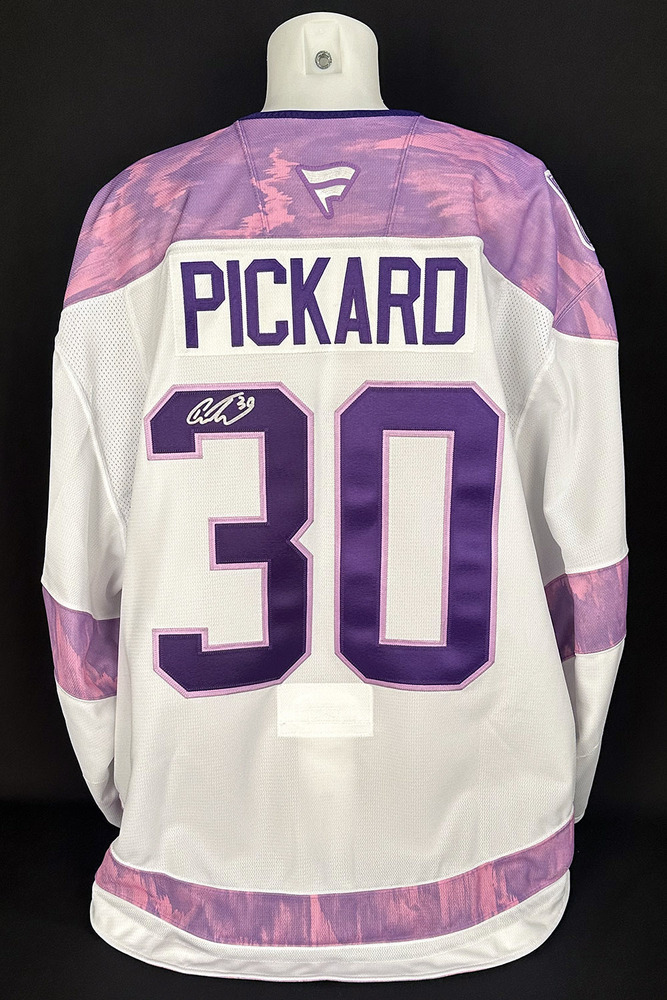 Welcome to the Edmonton Oilers Community Foundation 2025 Online Charity Auction! Show your support for the Foundation and the great charitable initiatives they undertake in Oil Country by bidding on this Calvin Pickard #30 - Autographed 2025-26 Edmonton Oilers Hockey Fights Cancer Night Ltd Edition Jersey (Autographed Only / Not Worn On Ice). During the Oilers vs Dallas Stars game on the evening of Tuesday November 25th, 2025 in support of the NHL Hockey Fights Cancer initiative the team hosted their annual Hockey Fights Cancer night. Although NHL teams are no longer permitted to wear cause based jerseys during the pre-game warm up a complete set of these special jerseys were made and autographed by the players with the purposes of auctioning off all in support of charity! This Fanatics made pro quality jersey with fight strap features a lavender color Oilers logo on the front and NHL Hockey Fights Cancer crest on the right shoulder. On the back of the jersey the respective player's surname is displayed in lavender letters on a white name bar and their jersey number in a two tone lavender and purple pro twill. Inside the collar the jersey is marked Made in Canada and a size 58G tag is present. Last but not least the jersey has been nicely autographed in silver paint marker on the back number by Calvin Pickard! Please note this is an actual game-weight on-ice authentic jersey (NOT WORN BY PLAYER ON ICE) with all lettering, numbering and crests professionally stitched onto the jersey. The jersey will come complete with a Letter of Authenticity from the Edmonton Oilers Hockey Club and official Edmonton Oilers 2025-26 Season Hockey Fights Cancer Night Autographed Jersey Set, (Team Issue Only / Not Worn On Ice) Tag including their # and surname sewn into the inside bottom hem of the jersey.