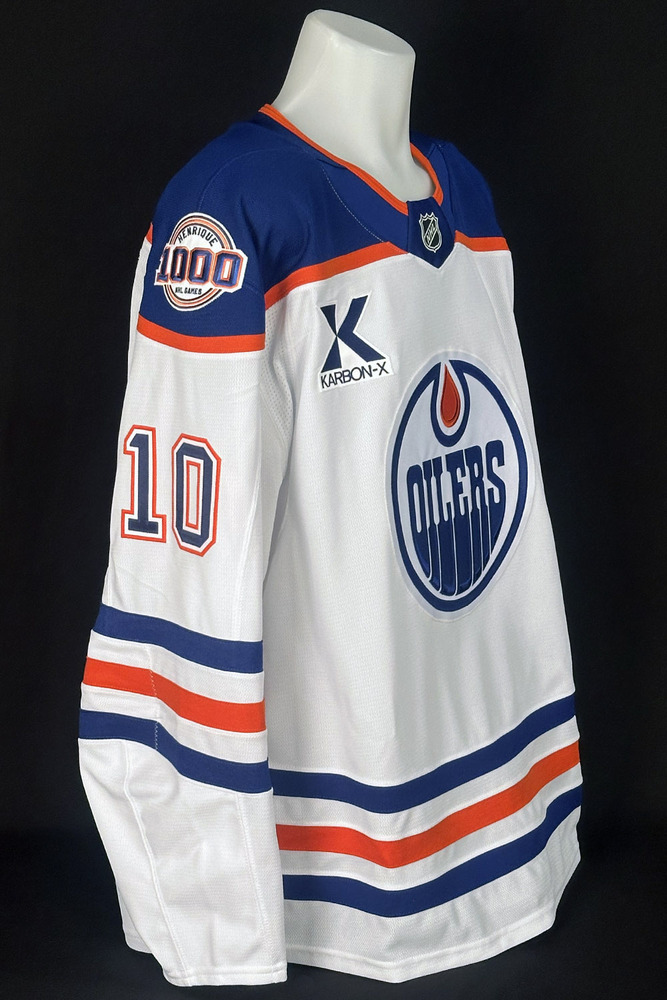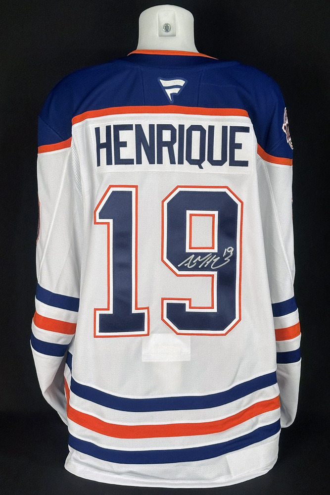 Welcome to the Edmonton Oilers Community Foundation 2025 Online Charity Auction! Show your support for the Foundation and the great charitable initiatives they undertake in Oil Country by bidding on this Trent Frederic #10 - 2025-26 Edmonton Oilers Pre-Game Warm-Up Worn Tribute Jersey From Adam Henrique's 1000th NHL Game On October 21, 2025. On this night the team wore a brand new road set of Oilers white jerseys made by Fanatics for the pre-game warm-up only honouring Adam Henrique's 1000th NHL game. The jerseys were all customized with HENRIQUE on the name bar and his #19 on the back. The respective player who wore the jersey had their normal jersey number on the sleeves. A special commemorative 1000th NHL Game patch was added to the right shoulder honouring Henrique's milestone game. The jersey also features a special uniform set tag with unique serial # sewn into the inside bottom hem. The tag reads "ADAM HENRIQUE 1000TH NHL GAME, PRE-GAME WARM UP SET, OCT 21, 2025 VS OTTAWA SENATORS" along with the player's jersey # and surname. In addition, an Edmonton Oilers Game-Worn Jersey Inventory serial #D00186 unique to this jersey only is imprinted on the edge of the set tag. This particular jersey is a size 58 and was worn by Oilers forward Trent Frederic #10 and is crested with his #10 on the sleeves. As is to be expected there is no significant wear considering the jersey was only worn for the pre-game warm-up and washed following the game. Lastly the jersey comes nicely autographed in silver marker by Adam Henrique on the back #9 and the respective player who wore it in blue marker on the inside set tag. In addition to the set tag certification mentioned above the jersey comes complete with a Letter of Authenticity from the Edmonton Oilers Hockey Club.