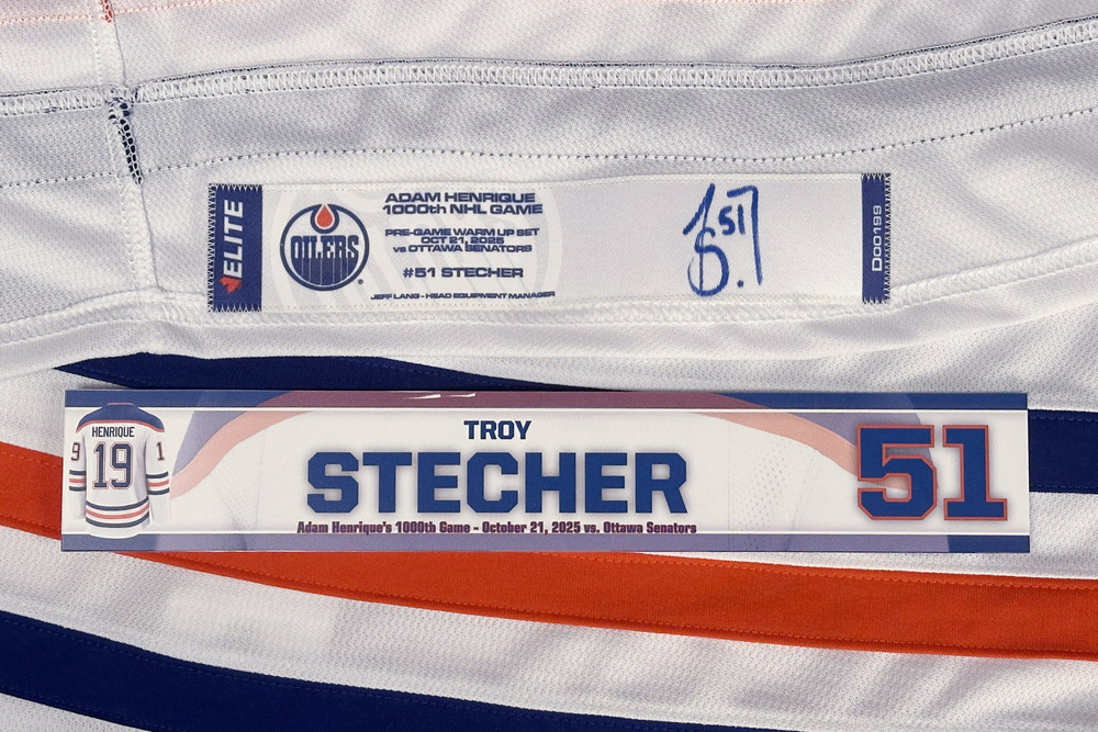 Troy Stecher #51 - 2025-26 Edmonton Oilers Pre-Game Warm-Up Worn Tribute Jersey From Adam Henrique's 1000th NHL Game On October 21, 2025 - Includes Bonus Locker Room Name Plate From Game!