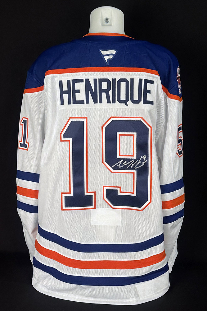 Welcome to the Edmonton Oilers Community Foundation 2025 Online Charity Auction! Show your support for the Foundation and the great charitable initiatives they undertake in Oil Country by bidding on this Troy Stecher #51 - 2025-26 Edmonton Oilers Pre-Game Warm-Up Worn Tribute Jersey From Adam Henrique's 1000th NHL Game On October 21, 2025. On this night the team wore a brand new road set of Oilers white jerseys made by Fanatics for the pre-game warm-up only honouring Adam Henrique's 1000th NHL game. The jerseys were all customized with HENRIQUE on the name bar and his #19 on the back. The respective player who wore the jersey had their normal jersey number on the sleeves. A special commemorative 1000th NHL Game patch was added to the right shoulder honouring Henrique's milestone game. The jersey also features a special uniform set tag with unique serial # sewn into the inside bottom hem. The tag reads "ADAM HENRIQUE 1000TH NHL GAME, PRE-GAME WARM UP SET, OCT 21, 2025 VS OTTAWA SENATORS" along with the player's jersey # and surname. In addition, an Edmonton Oilers Game-Worn Jersey Inventory serial #D00199 unique to this jersey only is imprinted on the edge of the set tag. This particular jersey is a size 56 and was worn by Oilers defenseman Troy Stecher and is crested with his #51 on the sleeves. As is to be expected there is no significant wear considering the jersey was only worn for the pre-game warm-up and washed following the game. Lastly the jersey comes nicely autographed in silver marker by Adam Henrique on the back #9 and the respective player who wore it in blue marker on the inside set tag. In addition to the set tag certification mentioned above the jersey comes complete with a Letter of Authenticity from the Edmonton Oilers Hockey Club.