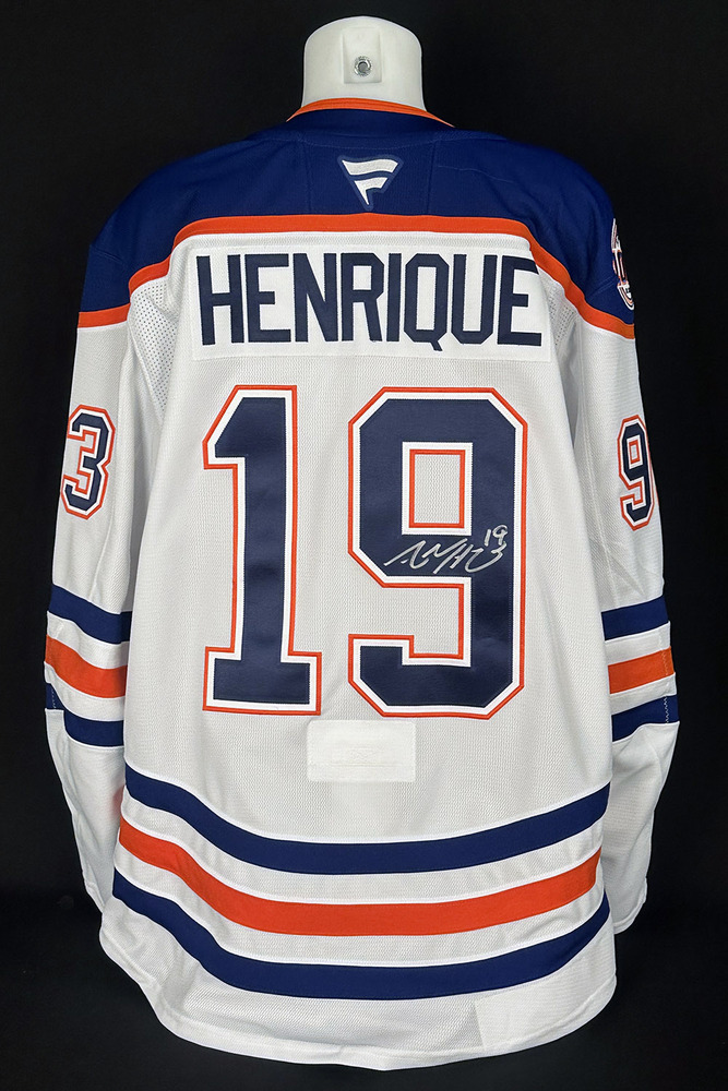 Welcome to the Edmonton Oilers Community Foundation 2025 Online Charity Auction! Show your support for the Foundation and the great charitable initiatives they undertake in Oil Country by bidding on this Ryan Nugent Hopkins #93 - 2025-26 Edmonton Oilers Pre-Game Warm-Up Worn Tribute Jersey From Adam Henrique's 1000th NHL Game On October 21, 2025. On this night the team wore a brand new road set of Oilers white jerseys made by Fanatics for the pre-game warm-up only honouring Adam Henrique's 1000th NHL game. The jerseys were all customized with HENRIQUE on the name bar and his #19 on the back. The respective player who wore the jersey had their normal jersey number on the sleeves. A special commemorative 1000th NHL Game patch was added to the right shoulder honouring Henrique's milestone game. The jersey also features a special uniform set tag with unique serial # sewn into the inside bottom hem. The tag reads "ADAM HENRIQUE 1000TH NHL GAME, PRE-GAME WARM UP SET, OCT 21, 2025 VS OTTAWA SENATORS" along with the player's jersey # and surname. In addition, an Edmonton Oilers Game-Worn Jersey Inventory serial #D00205 unique to this jersey only is imprinted on the edge of the set tag. This particular jersey is a size 56 and was worn by Oilers forward Ryan Nugent Hopkins #93 and is crested with his #93 on the sleeves. As is to be expected there is no significant wear considering the jersey was only worn for the pre-game warm-up and washed following the game. Lastly the jersey comes nicely autographed in silver marker by Adam Henrique on the back #9 and the respective player who wore it in blue marker on the inside set tag. In addition to the set tag certification mentioned above the jersey comes complete with a Letter of Authenticity from the Edmonton Oilers Hockey Club.