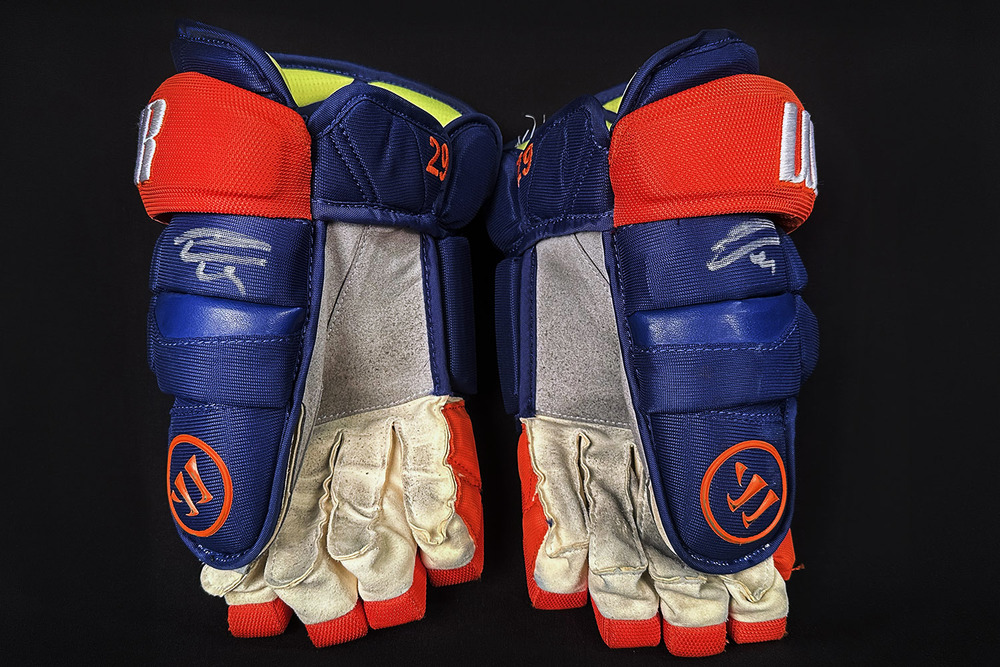 Welcome to the Edmonton Oilers Community Foundation 2025 Online Charity Auction! Show your support for the Foundation and the great charitable initiatives they undertake in Oil Country by bidding on this pair of Leon Draisaitl #29 - Edmonton Oilers game-worn hockey gloves. These Warrior Alpha Pro royal blue and orange nylon gloves were worn by Draisaitl during the second round of the 2024-25 NHL Play-offs vs the Vegas Golden Knights. They display nice use throughout, with moderate wear in the palms. Please note Draisaitl wears multiple pairs of gloves per season and two different sets at a time usually for 3 or 4 weeks and switches to another two pairs. He wore 2 different pairs during the 2nd round of the play-offs and this pair is marked "2" for pair two in permanent marker on the inside wrist padding. Both gloves have "DRAISAITL" and "29" factory-stitched on the cuffs and have been verified to be worn by Draisaitl by a member of the Oilers equipment staff. They are nicely autographed in silver marker on both gloves. They will come complete with a Letter of Authenticity from the Edmonton Oilers Hockey Club, Edmonton Oilers Authentic Inventory Hologram and Official Locker Room Equipment Program tag will be included inside the left glove.