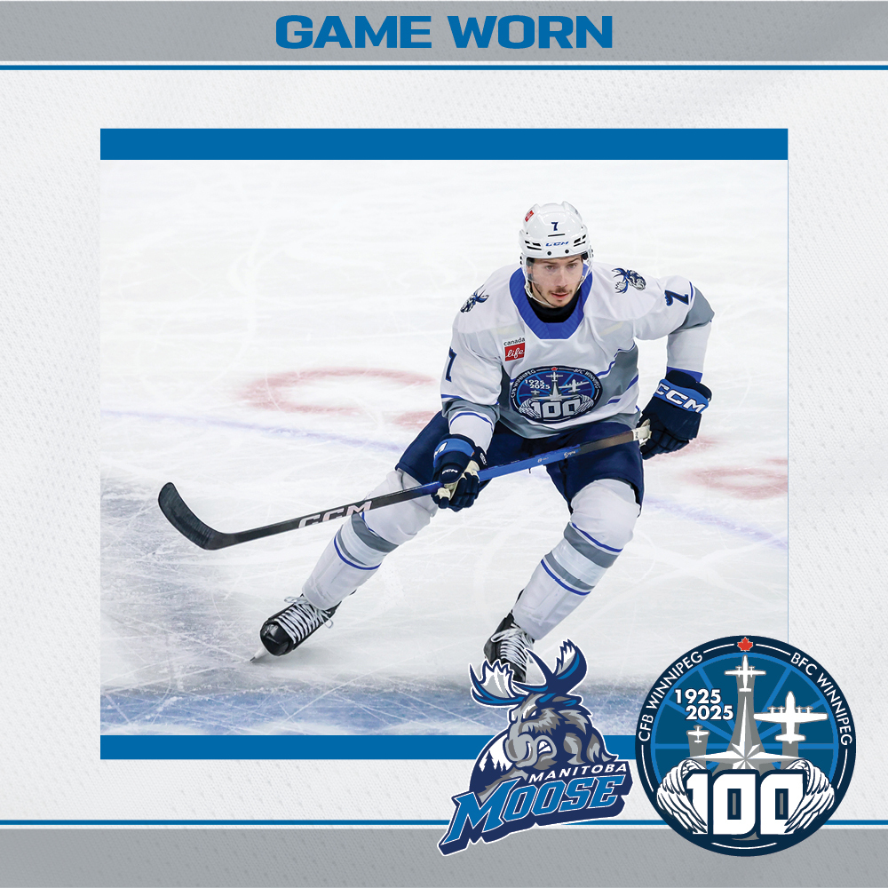 You are bidding on an authentic size 56 Manitoba Moose CFB Winnipeg 100th Anniversary Jersey. This unique CFB Winnipeg 100th Anniversary jersey was worn for the game on November 26, 2025, when the Manitoba Moose took on the Belleville Senators. All winning bidders will receive an Official Manitoba Moose Hockey Club Certificate of Authenticity and will have the option to have the player autograph their jersey at a date determined by the hockey club. Date and player availability to be determined. Local winners have the option to pick up this item.