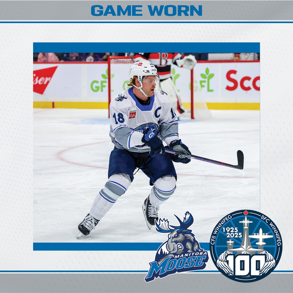 You are bidding on an authentic size 54 Manitoba Moose CFB Winnipeg 100th Anniversary Jersey. This unique CFB Winnipeg 100th Anniversary jersey was worn during 2nd and 3rd period for the game on November 26, 2025, when the Manitoba Moose took on the Belleville Senators. All winning bidders will receive an Official Manitoba Moose Hockey Club Certificate of Authenticity and will have the option to have the player autograph their jersey at a date determined by the hockey club. Date and player availability to be determined. Local winners have the option to pick up this item.