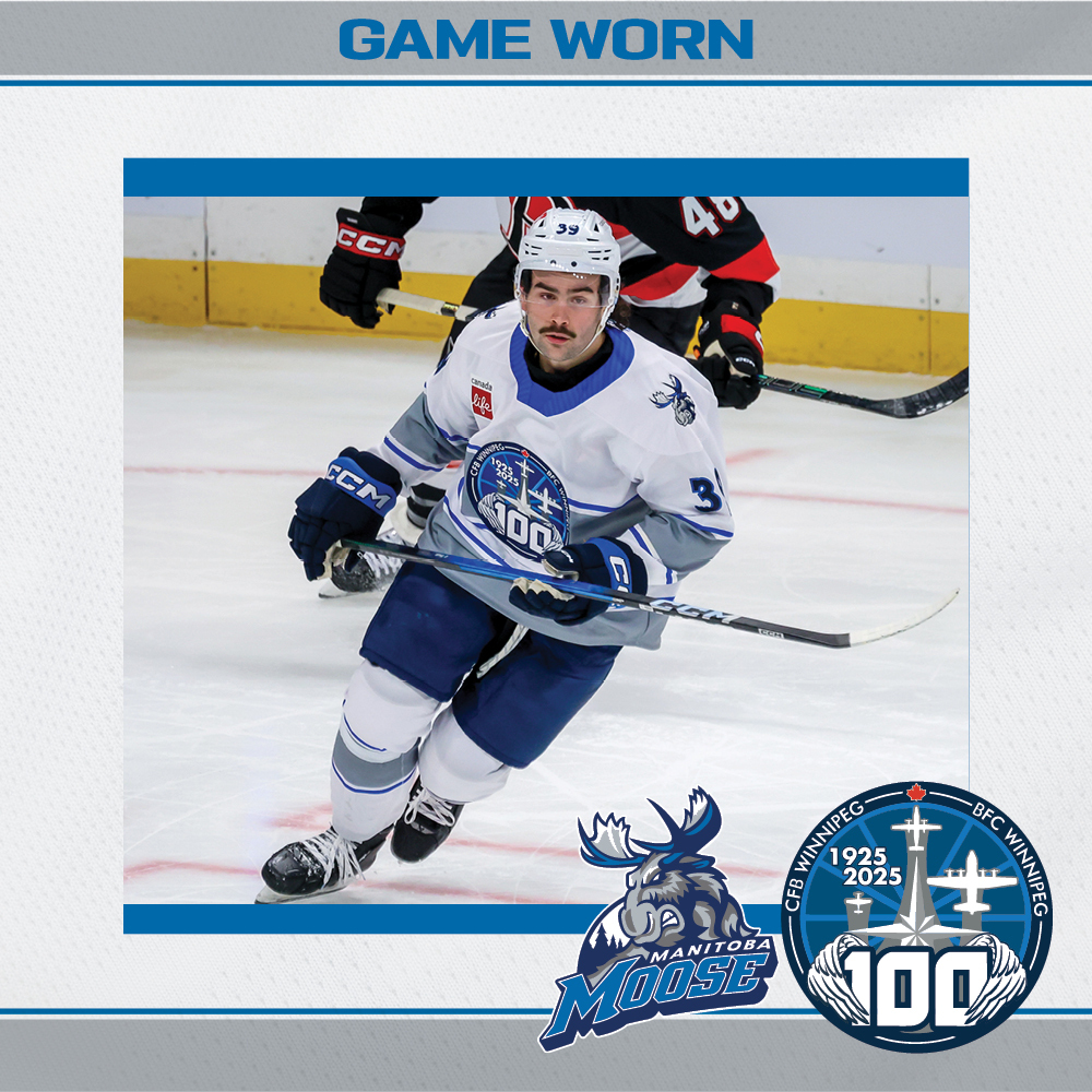 You are bidding on an authentic size 56 Manitoba Moose CFB Winnipeg 100th Anniversary Jersey. This unique CFB Winnipeg 100th Anniversary jersey was worn during warmup and 1st period for the game on November 26, 2025, when the Manitoba Moose took on the Belleville Senators. All winning bidders will receive an Official Manitoba Moose Hockey Club Certificate of Authenticity and will have the option to have the player autograph their jersey at a date determined by the hockey club. Date and player availability to be determined. Local winners have the option to pick up this item.