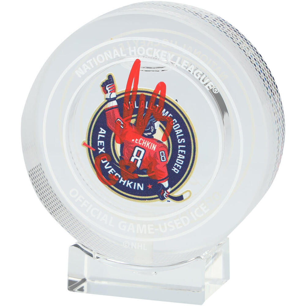 Alex Ovechkin Washington Capitals Autographed 895th Goal Crystal Puck with "GR8" Inscription - Filled with Game-Used Ice from a Washington Capitals Game During the 895th Goal Season