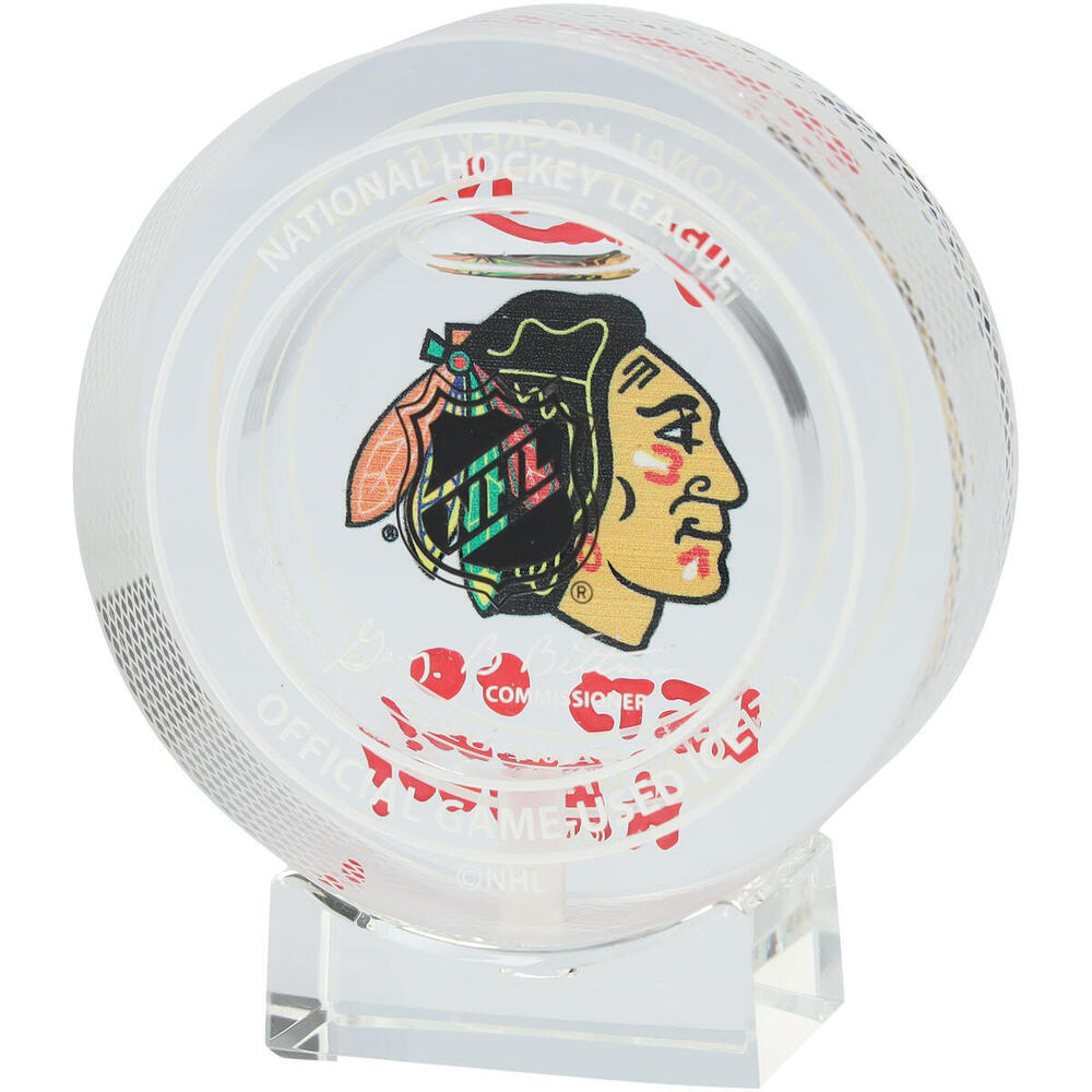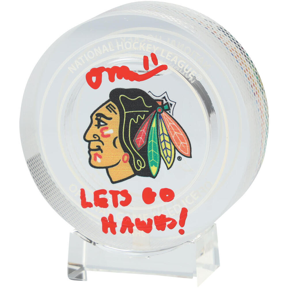 Oliver Moore Chicago Blackhawks Autographed Crystal Puck - Filled with Ice from the 2023-24 Season with "Lets Go Hawks" Inscription