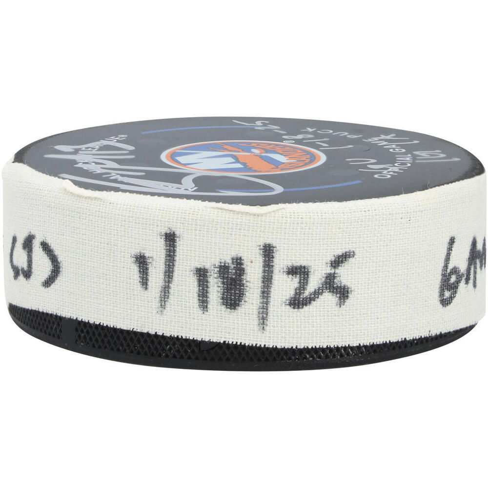 Mathew Barzal New York Islanders Autographed Game-Used Puck vs. San Jose Sharks on January 18, 2025 with Multiple Inscriptions