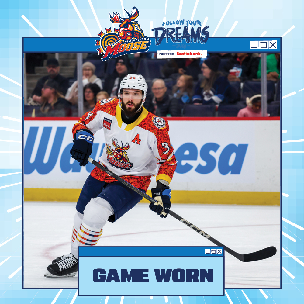 You are bidding on an authentic size 56 Manitoba Moose Follow Your Dreams Jersey. This unique Follow Your Dreams jersey was worn during warmup and 1st period on January 25, 2026, when the Manitoba Moose took on Grand Rapids Griffins. All proceeds from the auction will benefit Winnipeg Aboriginal Sports Achievement Center. All winning bidders will receive an Official Manitoba Moose Hockey Club Certificate of Authenticity and will have the option to have the player autograph their jersey at a date determined by the hockey club. Date and player availability to be determined. Local winners have the option to pick up this item.